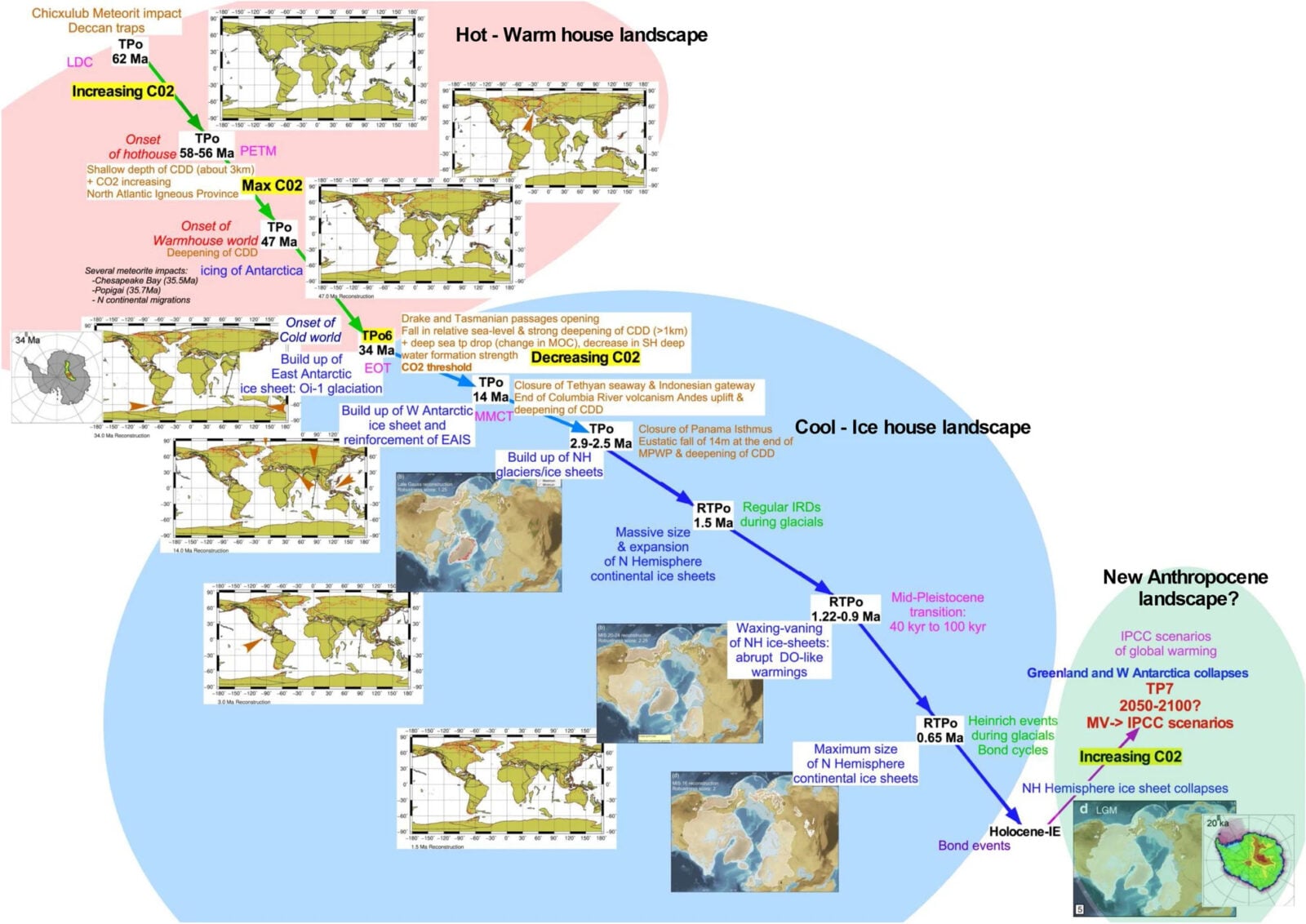 Oczywiście analiz klimatu nie można przeprowadzać bez odniesienia na przeszłości. Chodzi tutaj nie tylko o minione wieki, ale i o epoki geologiczne. Uczeni na podstawie ogromu danych paleoklimatycznych obejmujących cały kenozoik, czyli ostatnie 66 milionów lat, dokonali interpretacji ewolucji klimatu. Na początku ery trwał okres ciepły, a następnie okres chłodny zakończony epoką lodowcową. Nie działo się to oczywiście równomiernie, tylko z pewnymi skokami, tj. w myśl “przerywanej równowagi”. Takich chwilowych przemian zanotowano w trakcie kenozoiku dziewięć. Autorzy badań sugerują, że obecnie możemy być świadkami kolejnej, powolnej zmiany stanu Ziemi i przejścia na „tryb” podgrzewającego się klimatu.