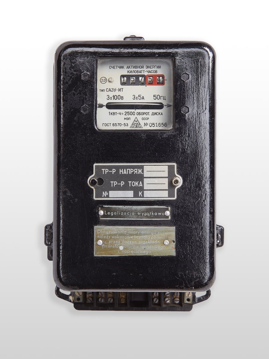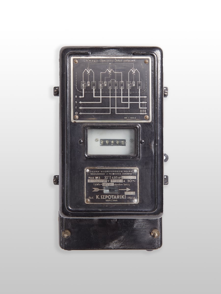 - Licznik energii elektrycznej prądu trójfazowego – D6B producent: Siemens przerobiony w Elektrowni w Warszawie produkcja ok. 1930