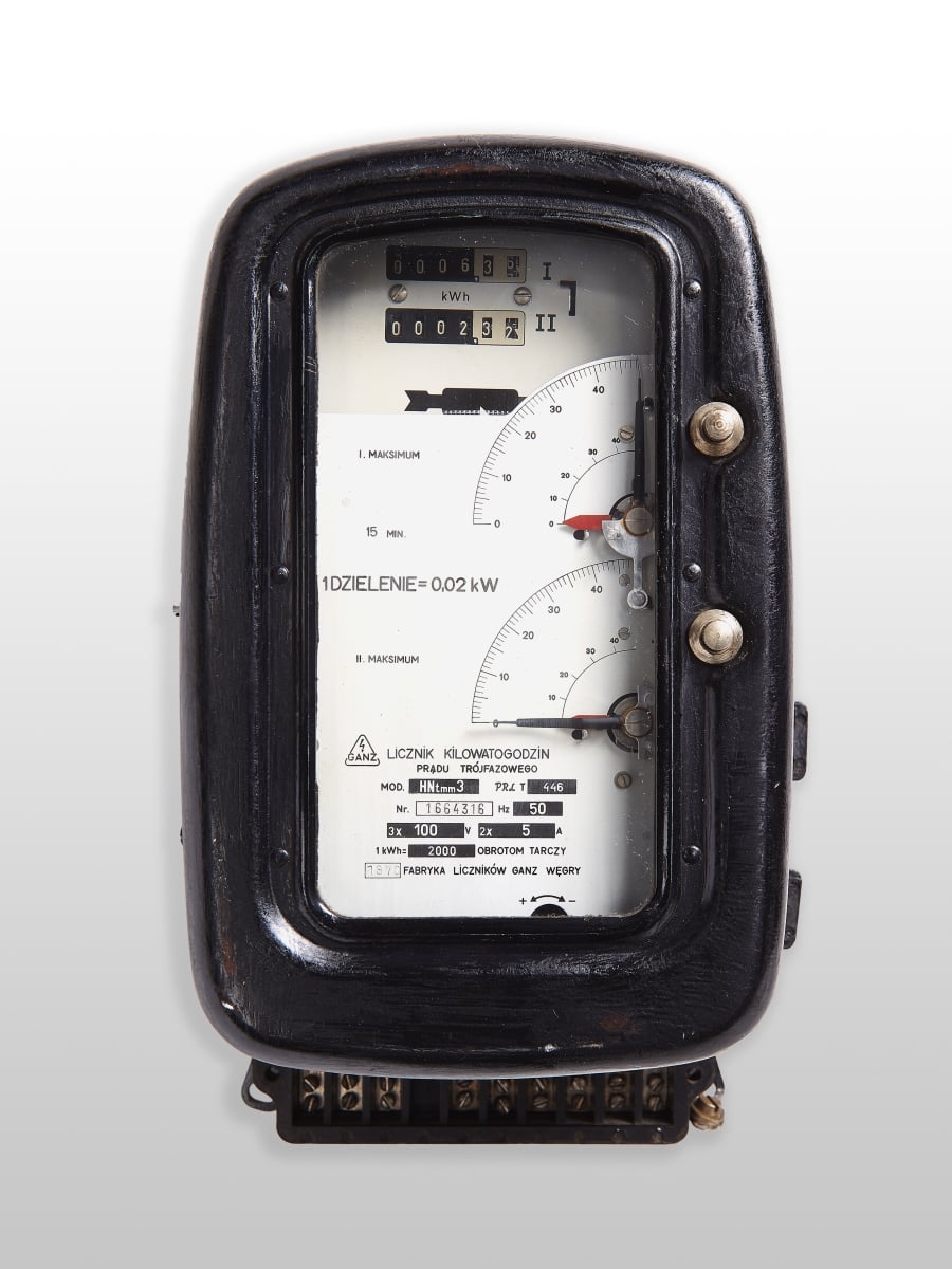 - Licznik energii elektrycznej prądu trójfazowego ze wskaźnikiem mocy maksymalnej – DHm4 producent: GANZ Fabryka liczników, Węgry rok produkcji : 1973 Dar Głównego Urzędu Miar