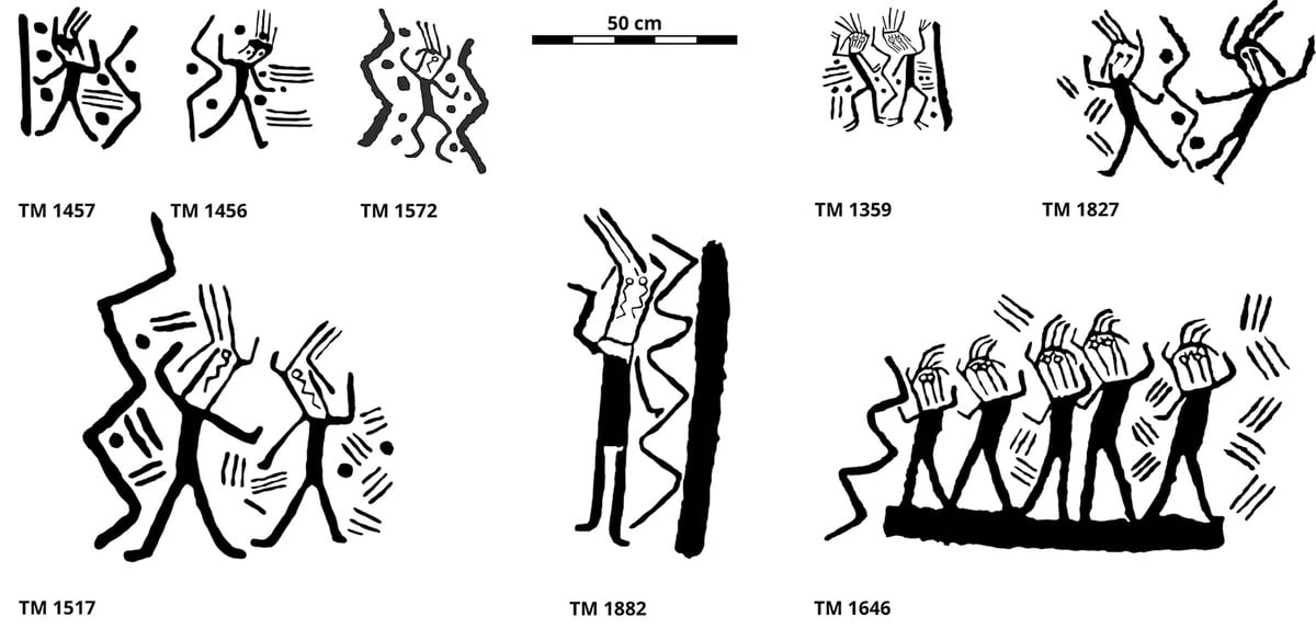 Obok tego wyraźnie rysują się tańce związane z inicjacją dziewcząt (często łączone z tzw. eland dance) oraz sceny, które wyglądają na mniej ceremonialne – bardziej towarzyskie, dla przyjemności. Ciekawie wypada przykład z Namahali: scena jest dynamiczna i zdaje się pokazywać dwie grupy jednocześnie, z osobami pochylonymi do przodu oraz z uczestnikami niosącymi narzędzia identyfikowane jako kije do kopania, użyteczne zarówno w praktykach związanych z przywoływaniem deszczu, jak i w zbieractwie.