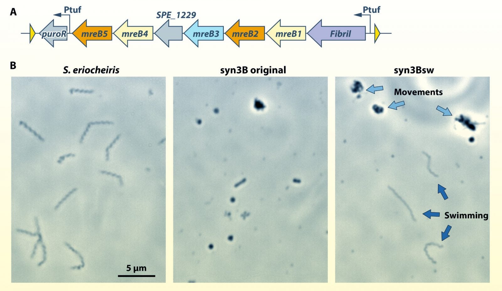 JCVI-syn3.0 dysponuje minimalnym zestawem genów i jest obdarzony szybkim tempem wzrostu, co jest korzystne dla manipulacji genetycznej. JCVI-syn3B to ulepszona wersja JCVI-syn3.0, wzbogacona o 19 dodatkowych genów z Mycoplasma mycoides, które ułatwiają jego wzrost. Dodano jeszcze siedem genów, by bakteria zmieniła kształt na helikalny. To wystarczyło (zmiana kształtu z kulistego na spiralny) do obdarzenia organizmu możliwościami ruchu