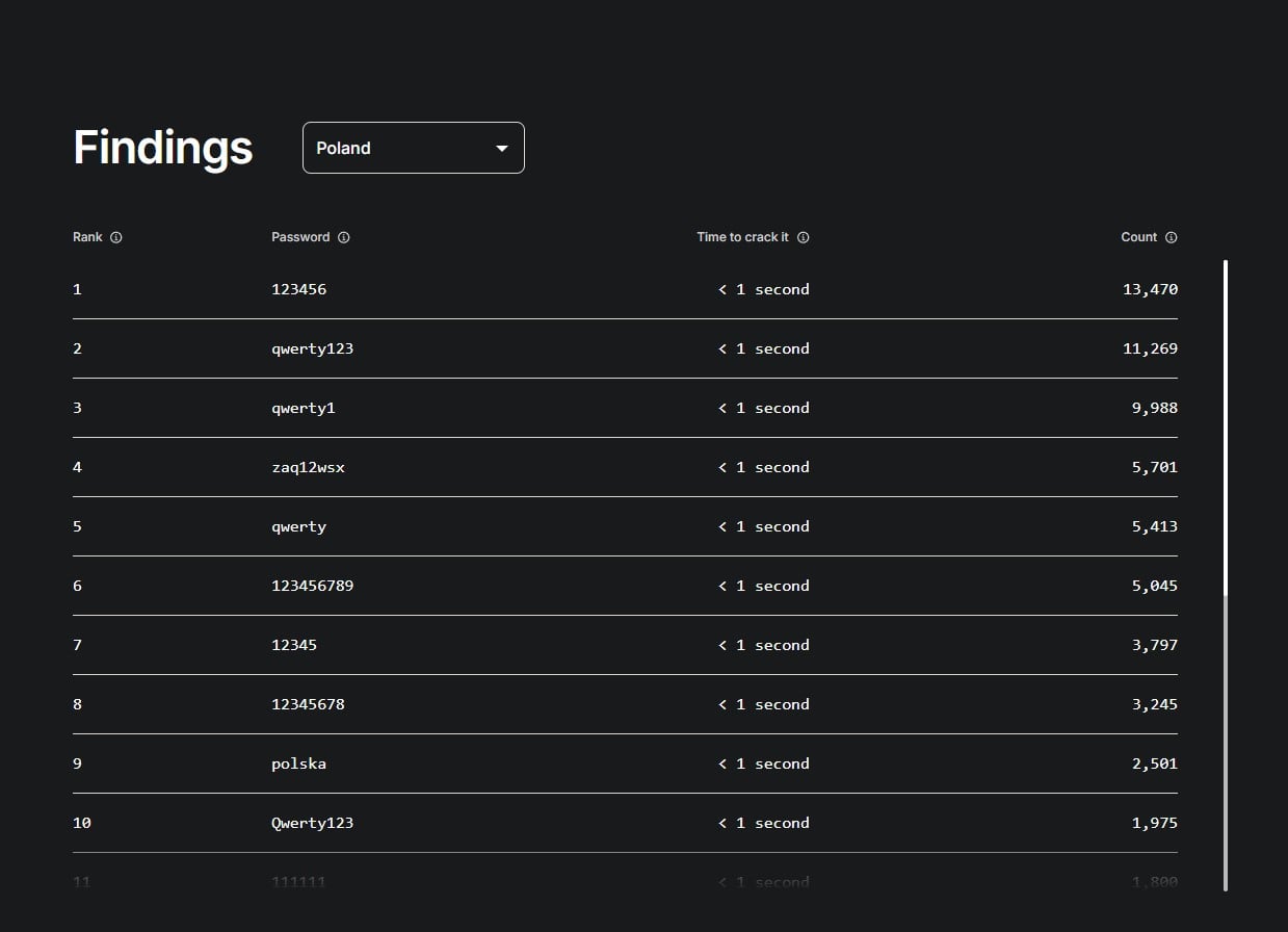 Po raz kolejny na szczycie zestawienia znalazło się hasło „123456”, którego na całym świecie używa ponad 3 mln internautów. Zanim zaczniecie się śmiać, w Polsce (po raz pierwszy mamy też takie zestawienie) również jest ono na pierwszym miejscu. Warto jednak zauważyć, że w porównaniu z zeszłym rokiem jego użycie zmalało o jakieś 1,5 mln, co nastraja optymistycznie. Mniej optymistyczny jest natomiast fakt, że na drugie miejsce wskoczyło hasło „123456789”, używane teraz przez przeszło 1,6 mln osób – to o 400 tys. więcej niż w zeszłym roku. Przeszło pół miliona osób zrezygnowało też z używania hasła „12345678”, choć i tak zajmuje ono trzecie miejsce na podium. Potem mamy całą litanię haseł pokroju „password”, „qwerty” z różnymi cyframi i jeszcze mniej skomplikowane ciągi znaków, których złamanie zajmuje mniej niż sekundę. W Polsce nie wygląda to niestety lepiej.