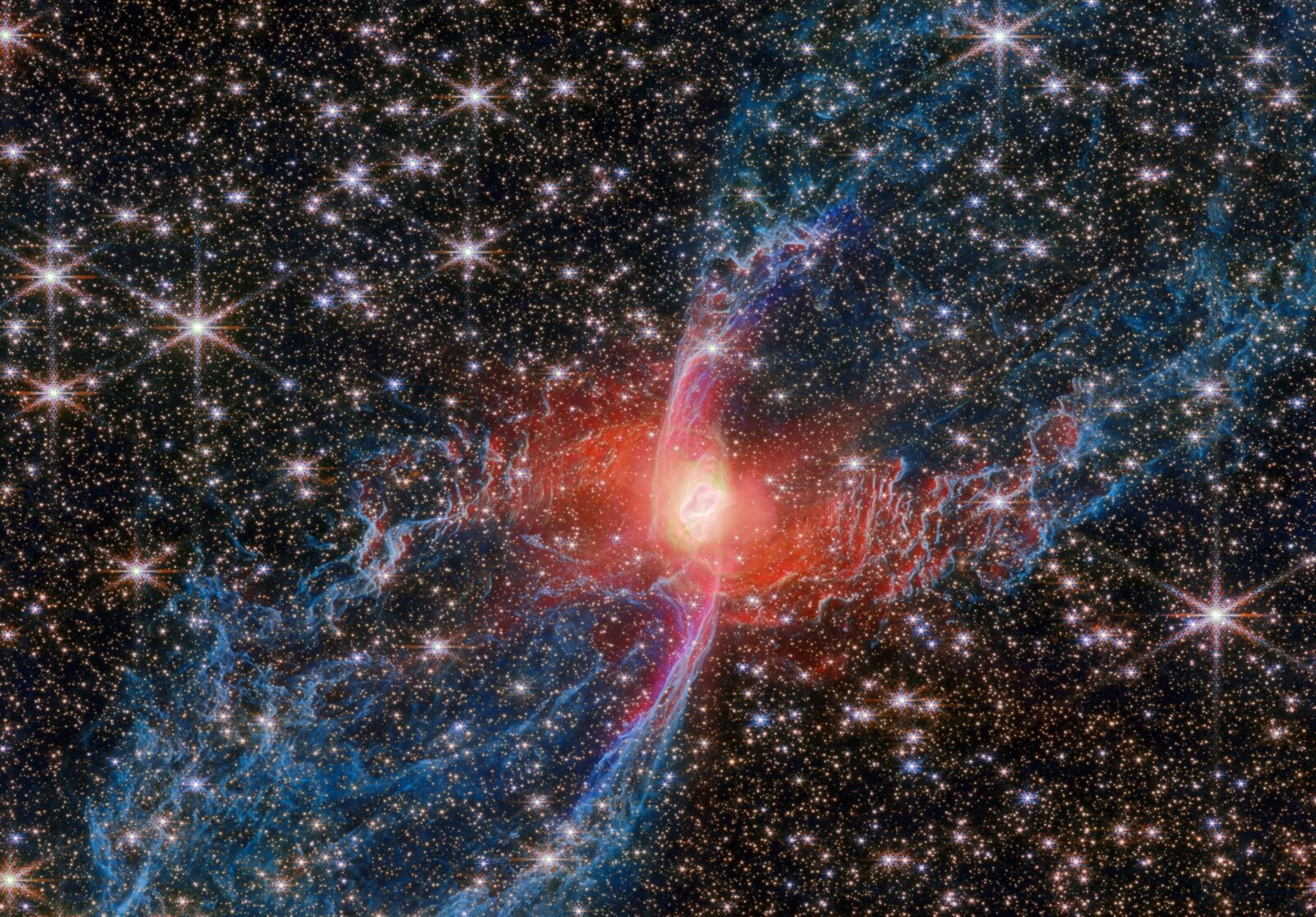 Na nowym zdjęciu z kamery NIRCam gwiazda centralna Czerwonego Pająka wreszcie wyraźnie świeci. W świetle widzialnym, na przykład na zdjęciach Hubble’a, była ledwie widoczna – drobna, blada, niemal nieodróżnialna od tła. Webb pokazuje ją jako jasny, czerwony punkt, znacznie wyraźniejszy od otaczającego gazu. To efekt obserwacji w podczerwieni, która rejestruje ciepło emitowane przez materię niewidoczną dla ludzkiego oka. Dzięki tej wrażliwości NIRCam odkrywa otaczający gwiazdę gorący pył, tworzący prawdopodobnie dysk obracający się wokół jej jądra. Tak bliskie otoczenie umierających gwiazd pozostawało dotąd niemal zupełnie ukryte, a jego struktura ma kluczowe znaczenie dla zrozumienia, jak powstają dżety i asymetryczne wypływy materii.