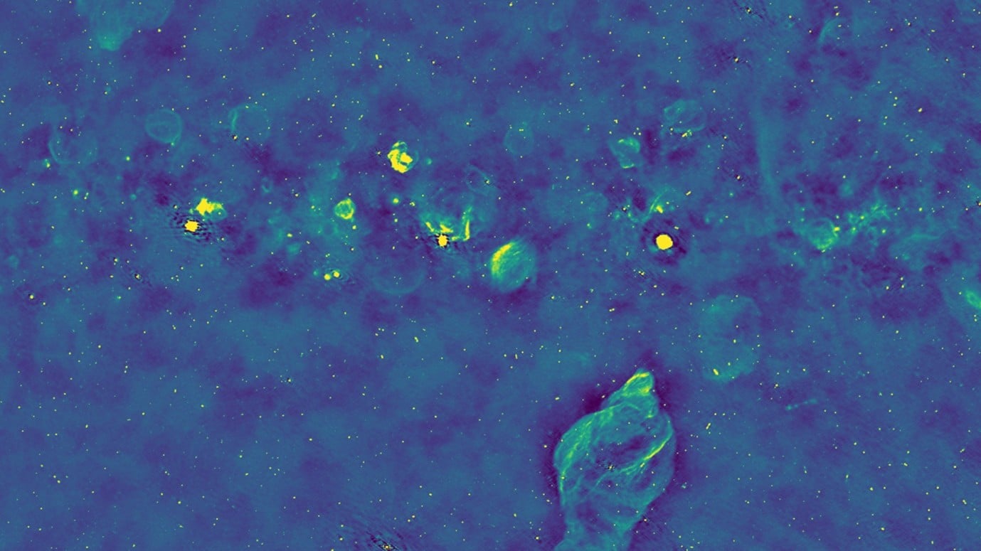 Jednym z najciekawszych efektów tej mapy jest to, jak dobrze pokazuje środowiska aktywnych supermasywnych czarnych dziur. W popularnym wyobrażeniu czarna dziura bywa po prostu ciemnym punktem pożerającym materię. W danych radiowych widać coś bardziej spektakularnego: całe rozbudowane struktury, radiowe płaty i dżety, które zdradzają, że w centrum galaktyki trwa potężny proces pompowania energii w otoczenie.