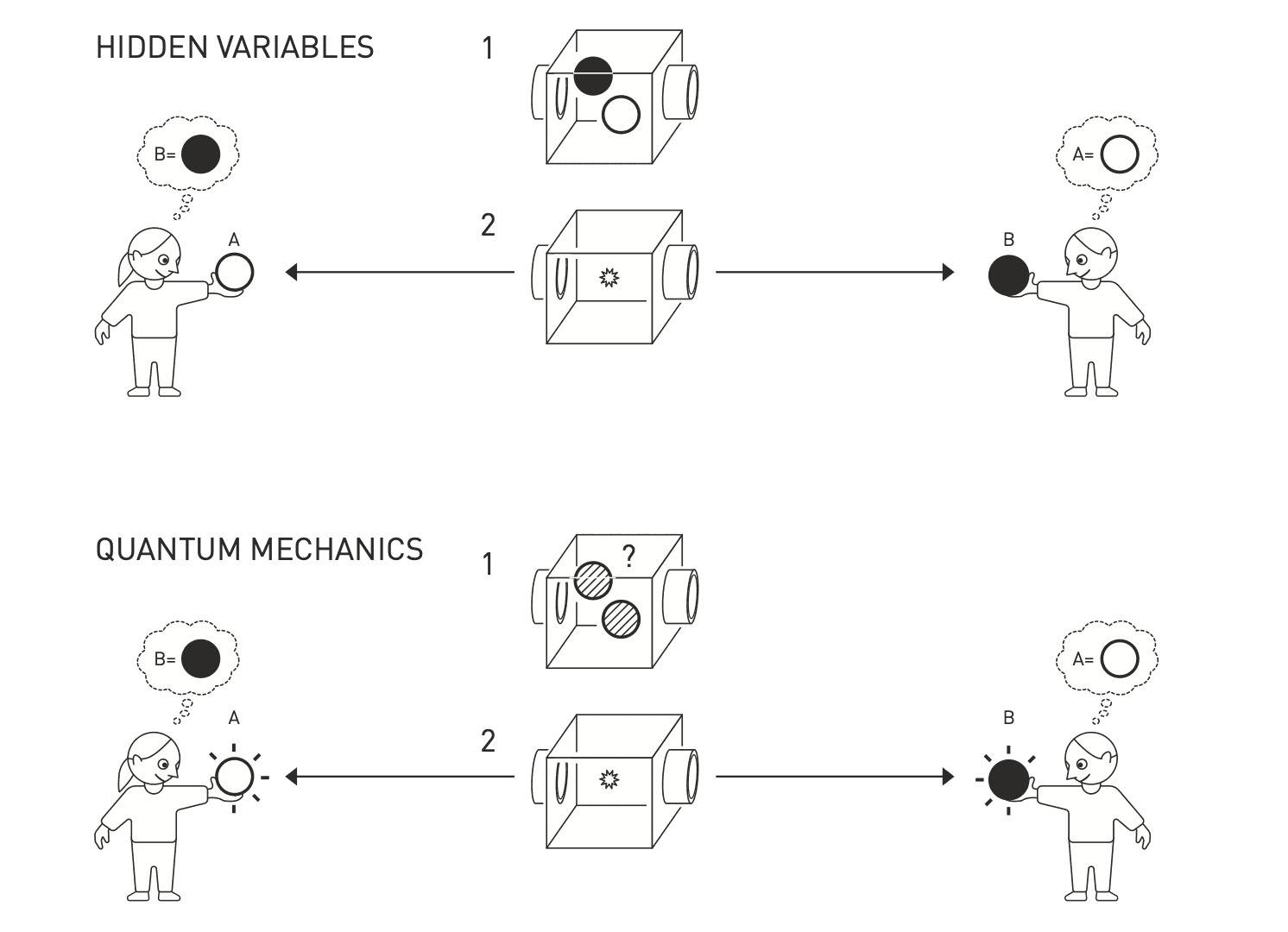 Splątane pary w mechanice kwantowej można porównać do maszyny, która wyrzuca w przeciwnych kierunkach kulki o przeciwnych kolorach. Gdy Bob złapie kulkę i zobaczy, że jest czarna, wie też, że Alice złapała kulkę białą. W teorii wykorzystującej ukryte zmienne, kulki zawsze zawierały ukrytą informację o tym, jaki kolor mają pokazać. Mechanika kwantowa mówi jednak, że kulki były szare, dopóki ktoś na nie nie spojrzał, kiedy to jedna losowo zmieniła kolor na biały, a druga na czarny. Nierówności Bella pokazują, że istnieją eksperymenty, które potrafią rozróżnić te przypadki. Takie eksperymenty udowodniły, że opis mechaniki kwantowej jest poprawny.