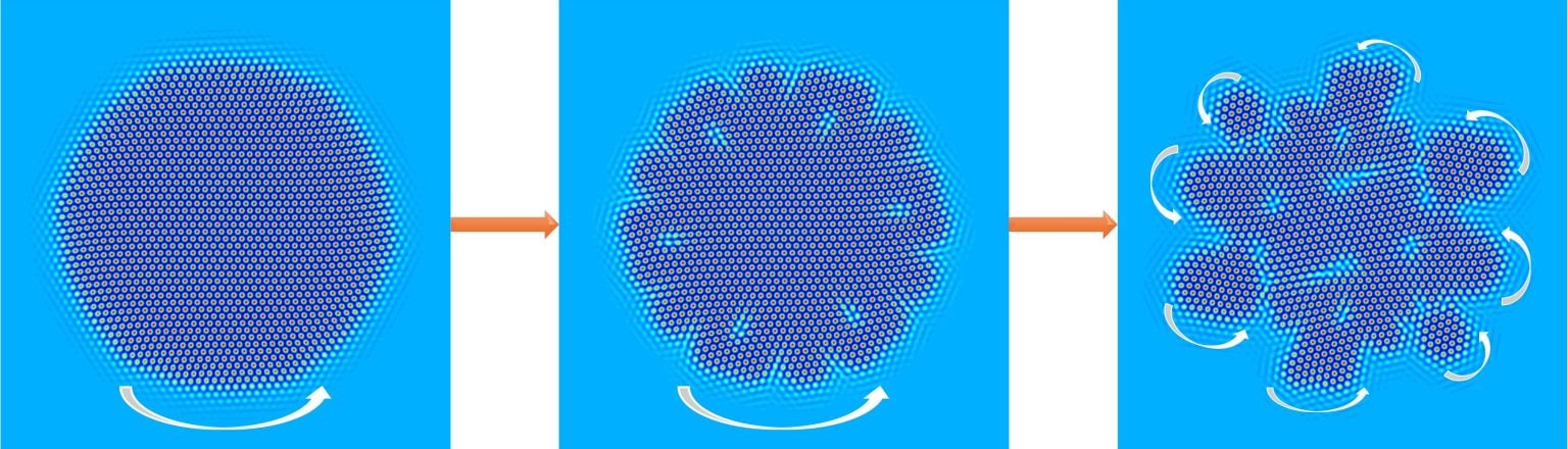 Jeszcze ciekawsze jest to, że fragmenty mogą ponownie się zorganizować i odtworzyć spójną strukturę. To nie jest samoregeneracja jak w reklamie etui na telefon, tylko konsekwencja tego, że układ dąży do pewnej dynamicznej formy porządku: elementy kręcą się, wchodzą w interakcje poprzeczne i potrafią zapiąć się w większą całość.