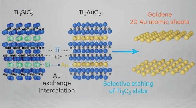 Badacze zaczęli od stworzenia specjalnej ceramiki przewodzącej prąd elektryczny. Zbudowano ją z węglika tytanu i krzemu. Następnie materiał pokryto złotem (Au). W dalszych krokach próbkę poddano działaniu wysokiej temperatury do momentu, gdy warstwa krzemu „zamieniła się” miejscem z Au. Wówczas uzyskano warstwę złota 2D, ale zlokalizowaną pomiędzy cząsteczkami węglika tytanu.