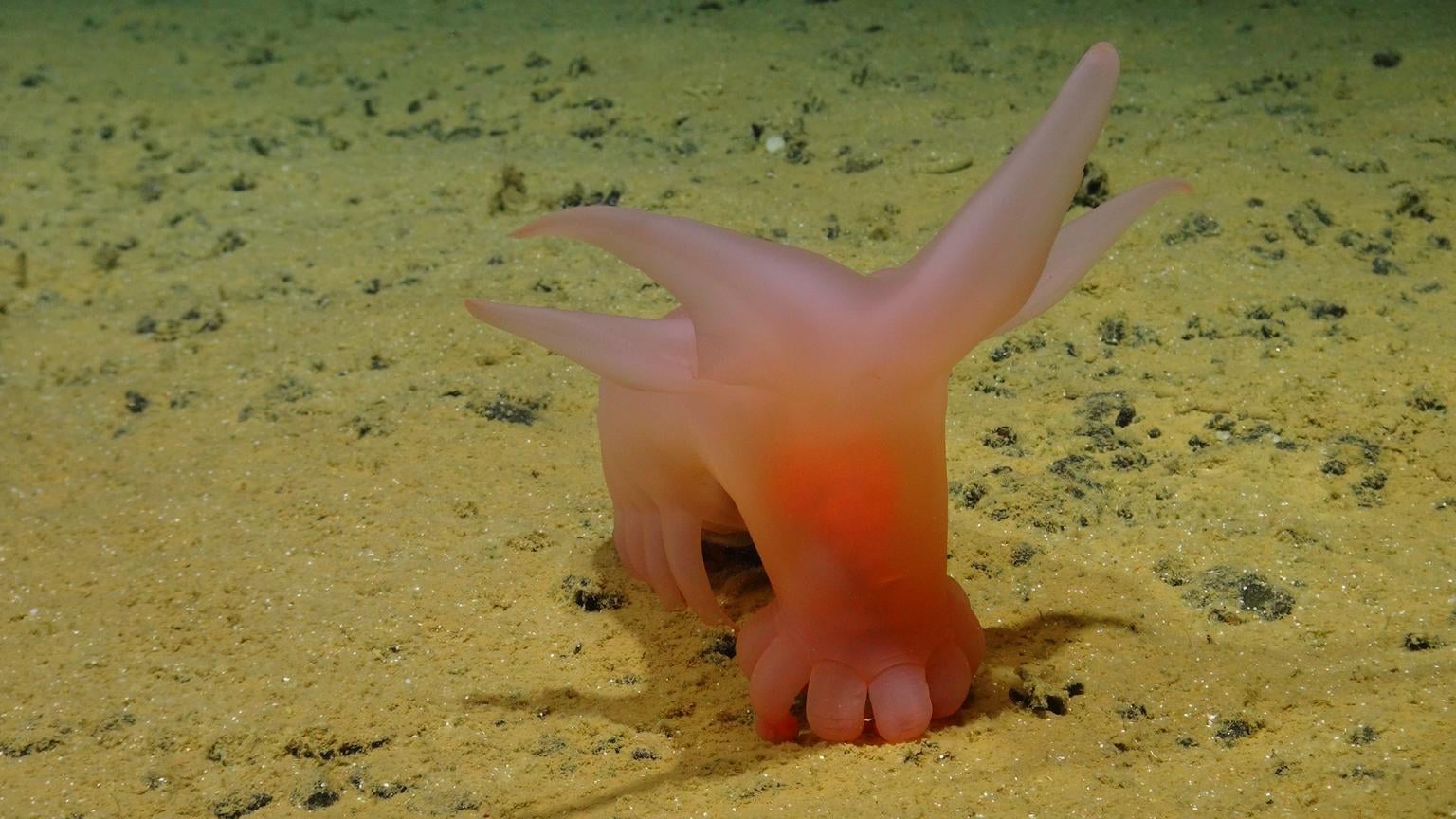 Jednym z najbardziej spektakularnych odkryć dokonanych podczas wyprawy jest przezroczysty ogórek morski należący do rodziny Elpidiidae. Można go zobaczyć na poniższym zdjęciu, na którym widać przewód pokarmowy stworzenia, a także długi, niezwykły ogon, prawdopodobnie służący do pływania.