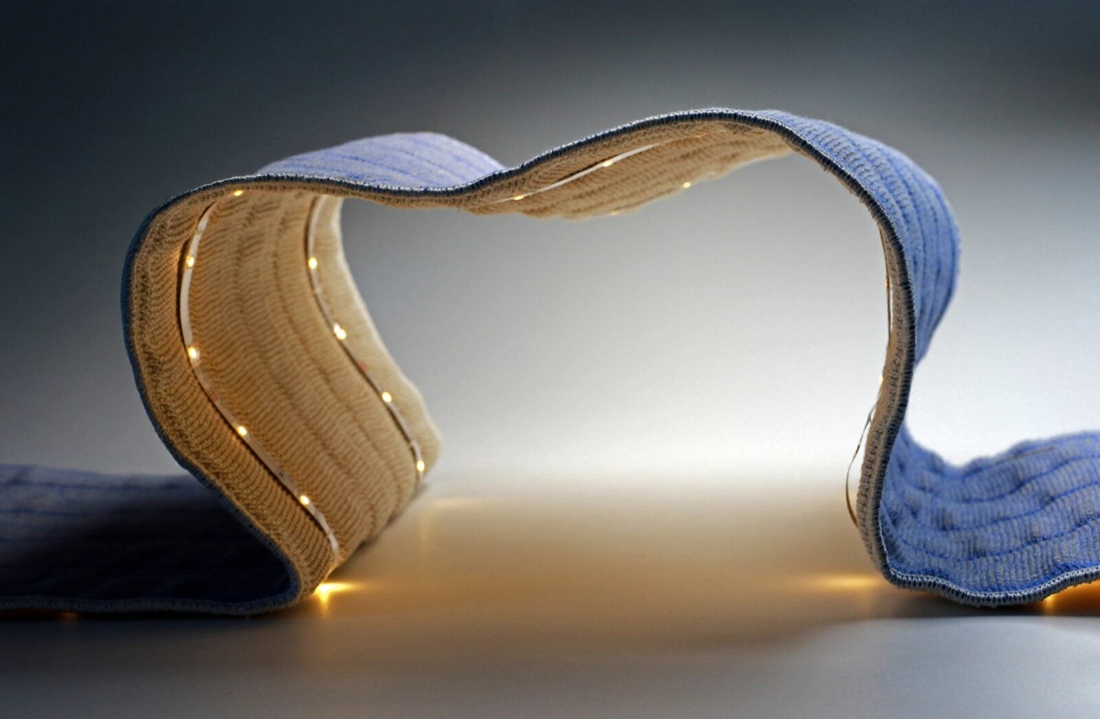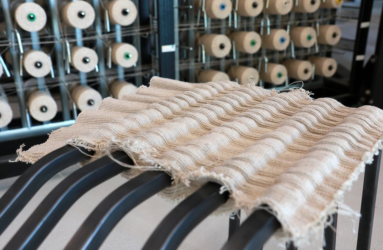 Punktem, w którym LinumTube najmocniej odróżnia się od typowego mebla tapicerowanego, jest sama produkcja tkaniny. W Fraunhofer WKI wykorzystuje się do tego krosno z podwójnym chwytakiem i osprzętem żakardowym, które pozwala w jednym przebiegu wytkać wielowarstwową strukturę zintegrowaną z kanałami na rury. Po zejściu z maszyny materiał nie wymaga zszywania paneli ani skomplikowanego krojenia, bo wystarczy obrobić krawędzie i można go od razu naciągać na stalową ramę. Ta “tekstylna belka” pracuje jak element konstrukcyjny, a zmienna liczba warstw, sposób prowadzenia włókien i lokalne zgęszczenia pozwalają projektować strefy o różnej sztywności.