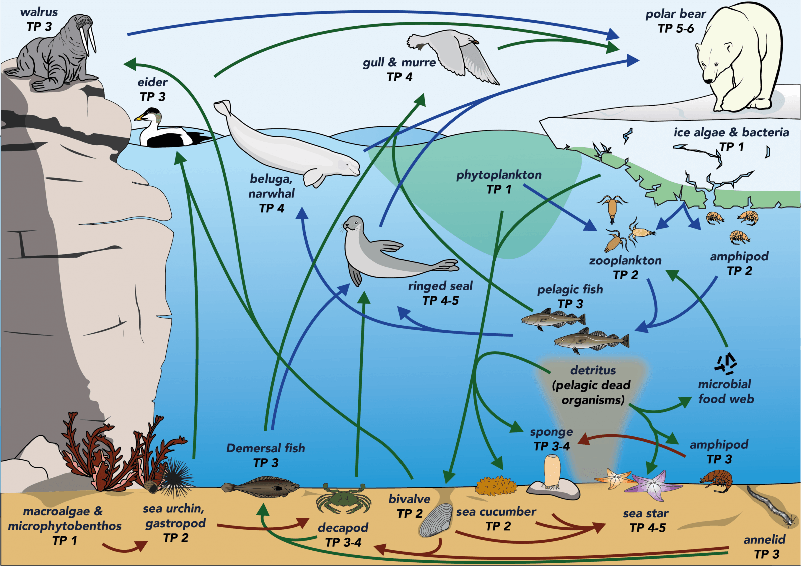 Sieć troficzna to sieć zależności pokarmowych między organizmami tego samego lub różnych gatunków, żyjących w jednym ekosystemie, mających podobne zwyczaje pokarmowe. Producenci pierwotni wspierają niższe poziomy troficzne (tj. pozycje żywieniowe w sieci pokarmowej), które przekazują energię do górnych drapieżników. Struktura troficzna organizmów pływających w wodzie morskiej (organizmów pelagicznych), które obejmują fitoplankton, bezkręgowce, ryby i ssaki morskie, jest szeroko badana, podczas gdy organizmom zamieszkującym dno morskie, zwanymi bentosem, poświęca się mniej czasu.