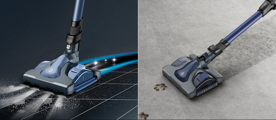 Do dyspozycji użytkownika jest pięć poziomów pracy – Auto, Eco, Eco+, Max i Boost, które sprawdzą się podczas sprzątania różnych powierzchni i zabrudzeń. Tym, co osobiście lubię w tego rodzaju sprzętach, jest możliwość wymontowania z niego mniejszego odkurzacza, bardziej poręcznego podczas odkurzania samochodu, mebli czy nawet zakurzonych półek. Jak też już wspomniałam, producent dodaje tutaj sporo akcesoriów i oprócz końcówki mopująco odkurzającej mamy też uniwersalną szczotkę z oświetleniem LED, wąską końcówkę, którą dotrzemy w każdy zakamarek czy też składaną rurę, wyjątkowo przydatną, gdy chcemy sięgnąć pod meble.