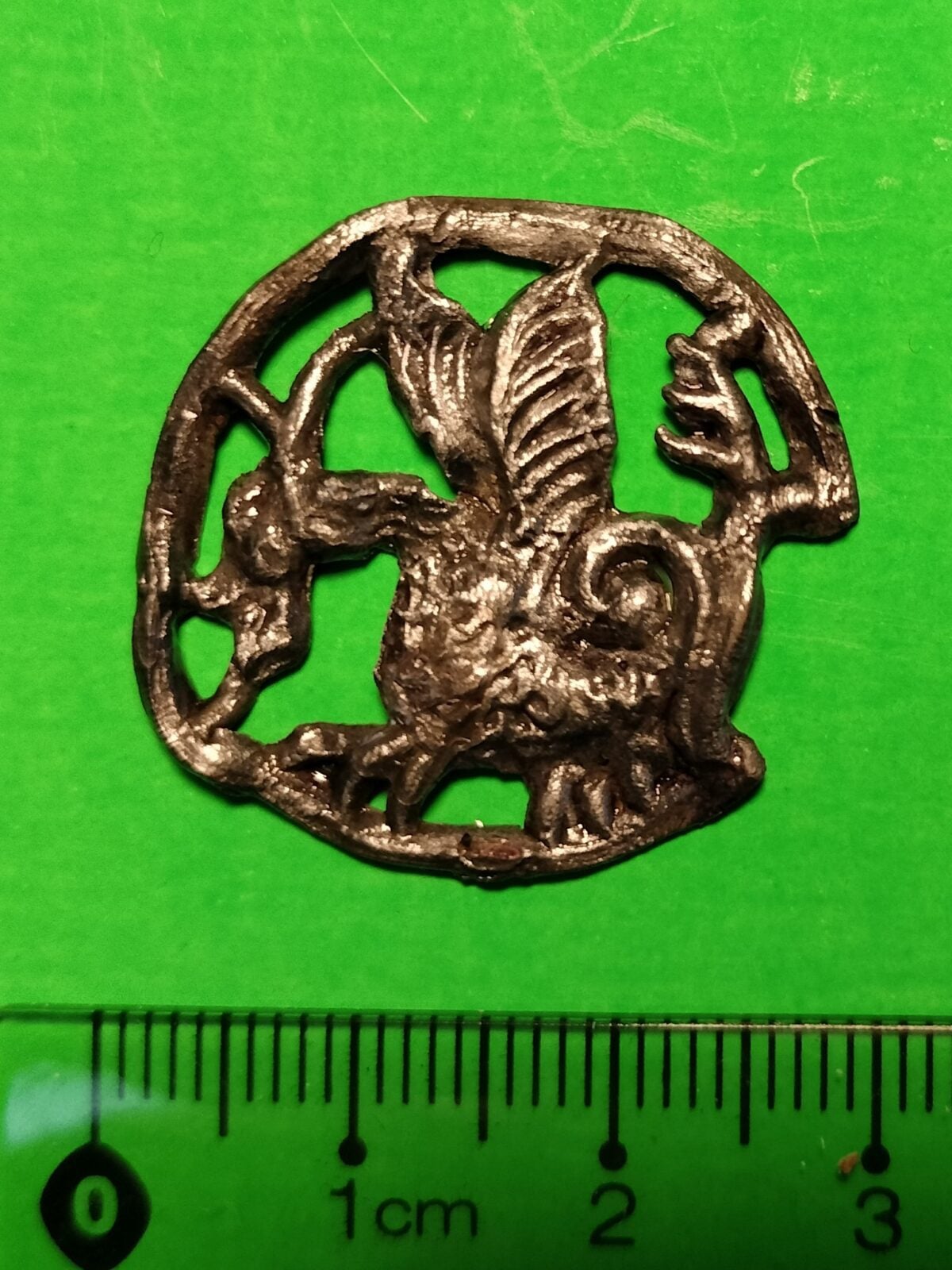 Tego typu odznaki miały najprawdopodobniej pełnić funkcję ochronną. Noszono je w formie talizmanów, a ten konkretny został wykonany ze stopu ołowiu i cyny. Okrągła zawieszka posiada wizerunek smoka, ma około 2,8 centymetra średnicy i zaledwie milimetr grubości. Historia tych artefaktów sięga czasów wczesnego średniowiecza. Do tej pory znajdowano je między innymi w Poznaniu, Żarnowie i Strzelinie.