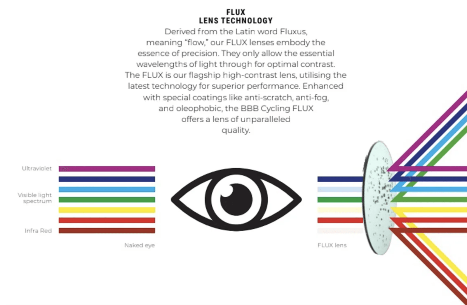 Nowe soczewki Flux zapewniają pełną ochronę przed promieniowaniem UV-A i UV-B oraz filtrują szkodliwe światło niebieskie i podczerwone. Ich powierzchnia została pokryta powłoką antyzarysowaniową oraz oleofobową, która odpycha wodę, błoto i kurz. Dodatkowo zastosowano warstwę zapobiegającą parowaniu, co ma kluczowe znaczenie w zmiennych warunkach atmosferycznych.