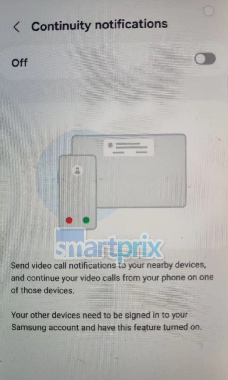 Zrzuty ekranu zdradziły też nową opcję, pozwalającą na przesyłanie połączeń wideo pomiędzy urządzeniami, do czego konieczne jest zalogowanie na konto Samsunga na obu urządzeniach. Nie jest to taka zupełna nowość, bo na Androidzie jest już podobna opcja od Google, więc najwyraźniej Samsung doszedł do wniosku, że chce mieć tutaj po prostu swoją wersję.