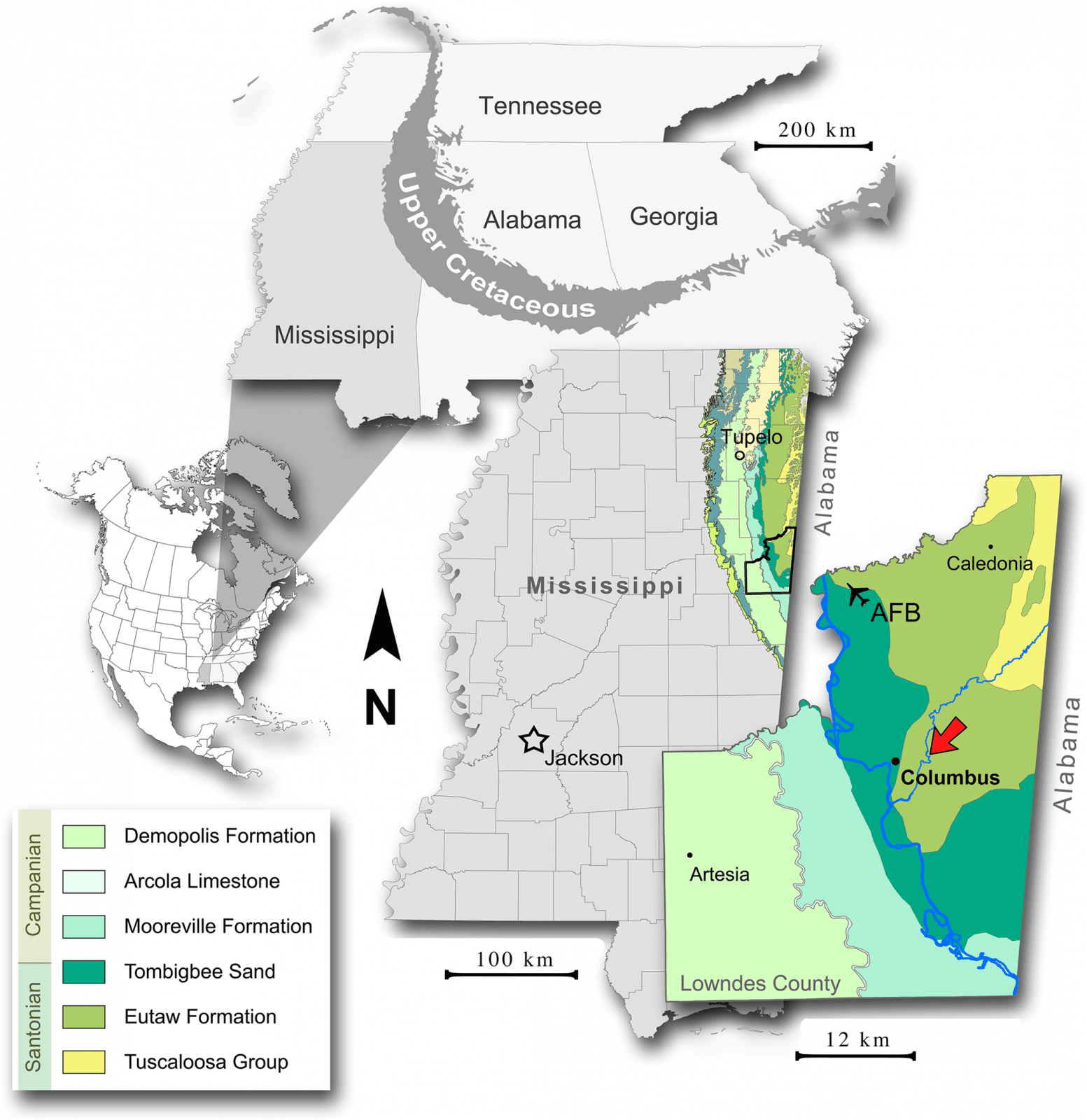Wracając do odkrycia z Ameryki Północnej, na terenie stanu Missisipi w późnokredowych skałach formacji Eutaw znaleziono skamieniałe kości kończyn, które należały do dwóch gatunków. Sprawa jest o tyle wyjątkowa, że o jednostce geologicznej, w której pojawił się zapis kopalny strusiopodobnych gadów, niewiele wiemy. W okresie późnej kredy tereny USA składały się z dwóch obszarów lądowych – Laramidii na zachodzie, na terenie której znaleziono już wiele skamieniałości gadów, i Appalachów na wschodzie, gdzie odkryto opisywane skamieniałości.