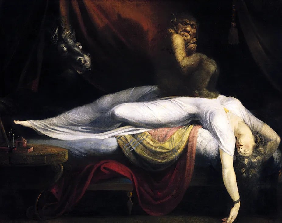 Jak się pewnie domyślacie, podobne motywy są często wykorzystywane w horrorach. Bohaterowie atakowani we śnie pojawiali się między innymi w filmach takich jak Last Night in Soho oraz Babadook. Reżyserowie decydowali się tam na pokazanie nocnych zjaw czających się na bezbronnych, sparaliżowanych ludzi, którzy właśnie się wybudzili. Warto też przyjrzeć się innemu dziełu kultury: powyższemu, XIX-wiecznemu obrazowi, na którym widzimy śpiącą kobietę przyciskaną we śnie przez przerażającą postać.