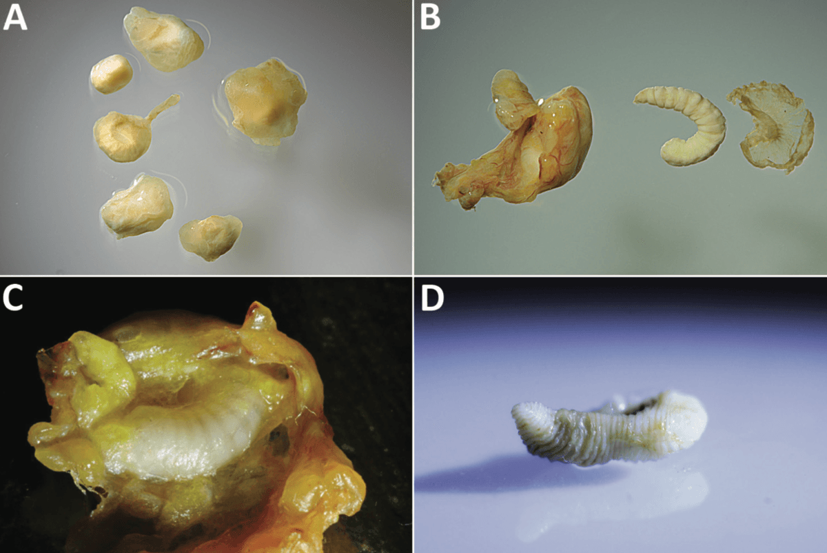 Lekarze podali, że 28-latka z Basankusu w Kongo nie wykazywała żadnych objawów poza zauważalnym guzem w kąciku oka. Po zbadaniu odkryli, że masa może się poruszać, i usunęli ją chirurgicznie, odsłaniając bladą larwę w kształcie litery C. Wysłali próbkę do dalszej analizy i odkryli, że mają do czynienia z gatunkiem Armillifer grandis.