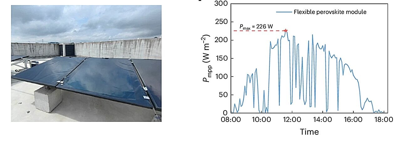 Jeszcze ciekawiej robi się przy większych powierzchniach. Zamiast zatrzymać się na typowych dla laboratoriów próbkach wielkości znaczka pocztowego, zespół zbudował całą rodzinę elastycznych modułów. Mniejsze, certyfikowane moduły osiągały sprawność na poziomie ponad 21% przy powierzchni nieco powyżej 20 centymetrów kwadratowych, a przy około 0,5 metra kwadratowego badaczom udało się uzyskać 17,38% sprawności i moc rzędu 86,9 W. Największy, elastyczny moduł o powierzchni około 1,47 metra kwadratowego zaczął generować 226 watów mocy i oferować imponującą gęstość mocy 558 W na kilogram masy.