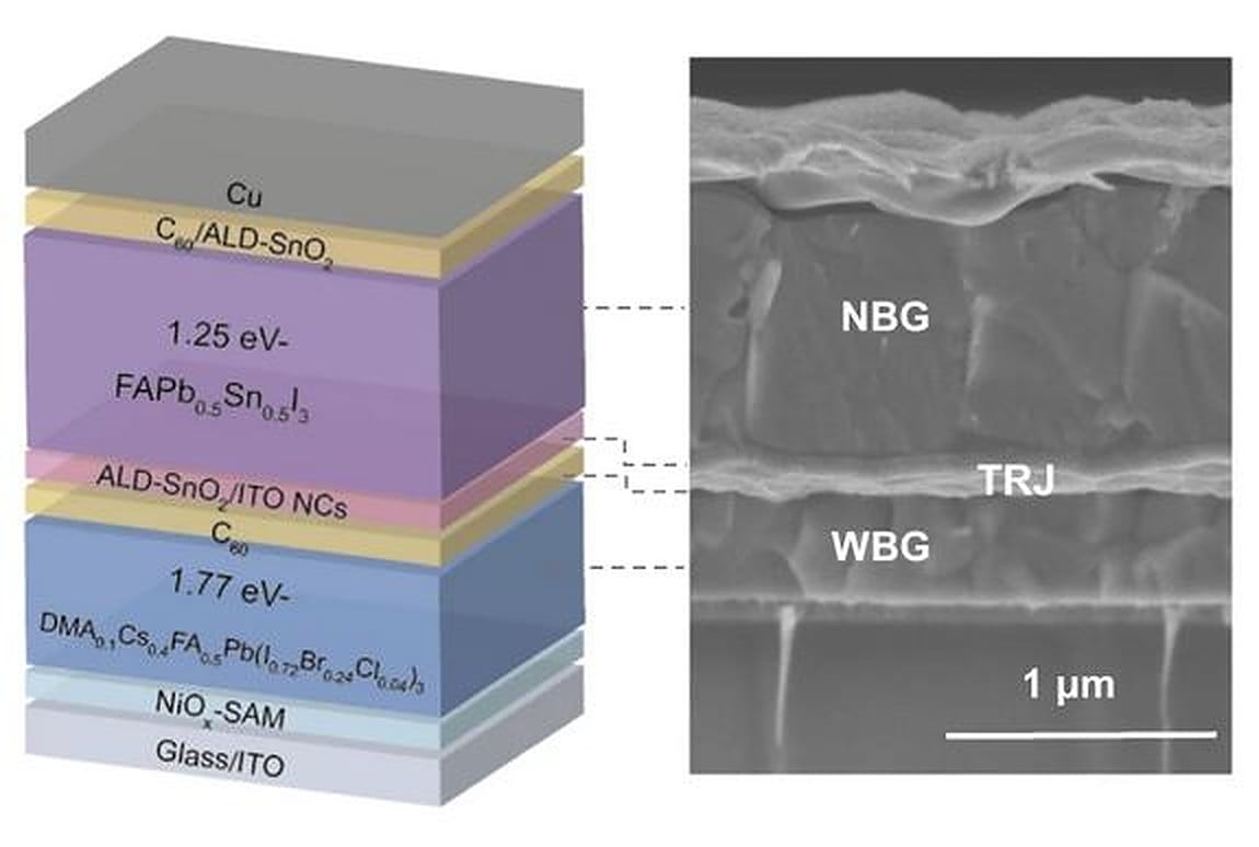 Podłoże chińskiego tandemowego ogniwa słonecznego składa się ze szkła i tlenku indu i cyny, warstwy transportującej dziury wykonanej z tlenku niklu, samoorganizującej się monowarstwy, absorbera perowskitowego, warstwy transportującej elektrony (C60), warstwy buforowej (BCP), warstwy tlenku cyny i miedzianego kontaktu.