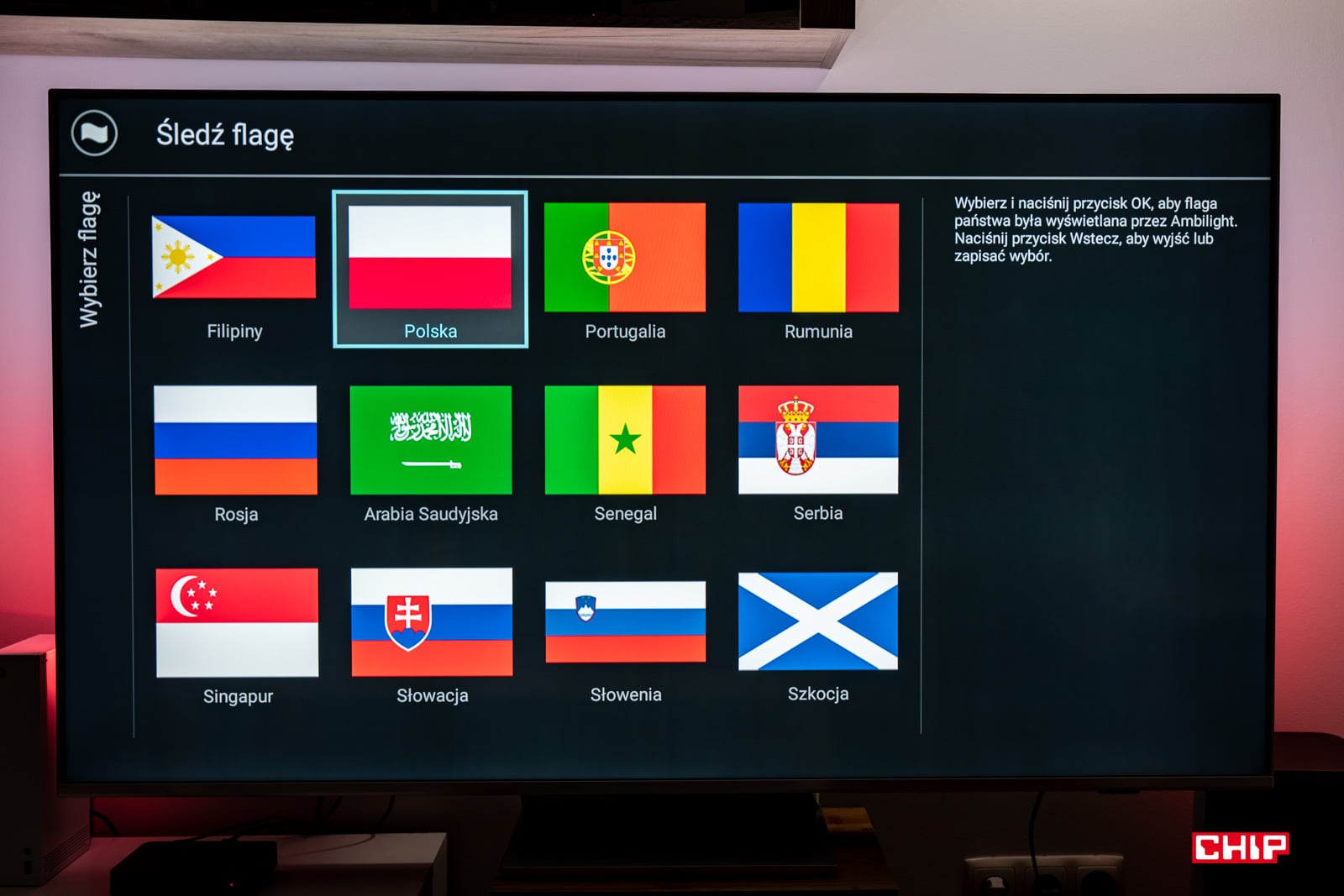 Sama praca podświetlenia działa w kilku trybach do wyboru. Gra świateł i kolorów może być w mniej lub bardziej dynamiczny sposób dopasowana do obrazu, ale również do odtwarzanego dźwięku, zmieniając się rytmicznie. Do dyspozycji mamy też stałe podświetlenie w dowolnym kolorze lub możliwość wyświetlenia barw wybranej flagi. Szczególnie przydatne podczas wydarzeń sportowych. Wszystkim możemy sterować z poziomu dedykowanej sekcji Ustawień, do której skrót znajduje się na pilocie.