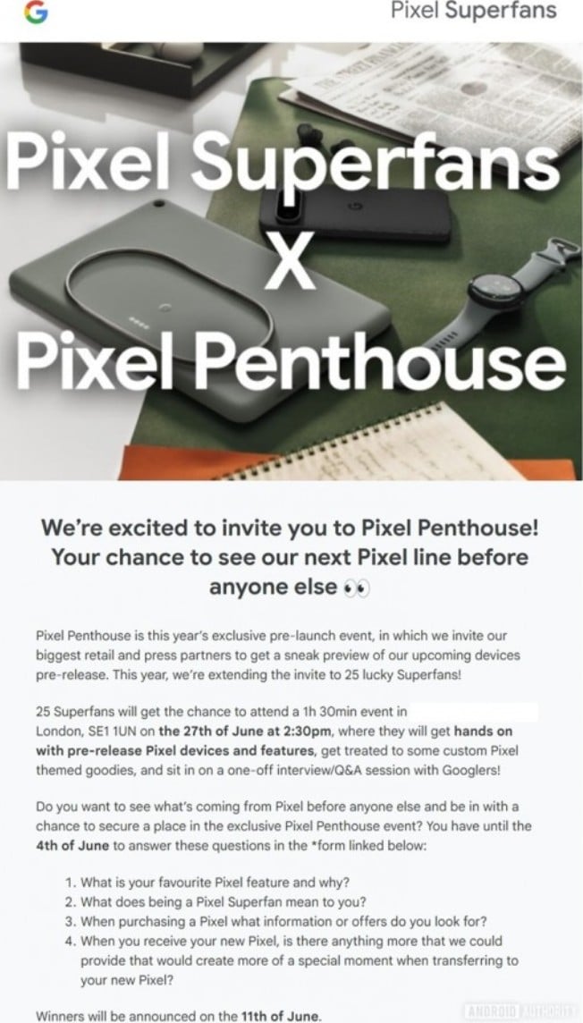 Jak donosi portal Android Authority, Google rozesłał zaproszenia do Pixel Superfans na specjalne wydarzenie zatytułowane “Pixel Penthouse”. Spotkanie odbędzie się 27 czerwca w Londynie, o godzinie 14:30 czasu lokalnego, potrwa półtorej godziny. Uczestnicy, czyli 25 szczęśliwców z programu Superfans, będą mieli okazję “wziąć w ręce przedpremierowe urządzenia i sprawdzić funkcje Google Pixel”.