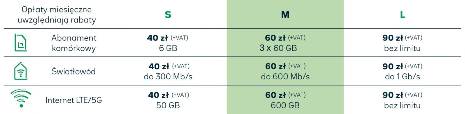 - Istnieje też możliwość rozszerzenia wszystkich wybranych usług z wariantu M do L za dodatkowe 30 zł/mies. + VAT. Dzięki temu zyskujesz między innymi szybszy światłowód (nawet do 1 Gb/s!) oraz nielimitowany dostęp do internetu mobilnego.
