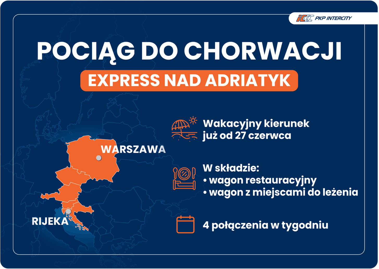 Pierwszy pociąg Intercity na linii Warszawa-Rijeka ruszy w trasę w piątek 27 czerwca. Odjazd zaplanowano na kilka minut po godzinie 14. Intercity zapowiada, że pociąg ten będzie kursował 4 razy w tygodniu: w poniedziałki, środy, piątki i niedziele. Pociągi powrotne będą kursowały w poniedziałki, środy, piątki i niedziele. Ostatni kurs został zaplanowany na 29 sierpnia z Warszawy i 31 sierpnia z Rijeki. Bilety będzie można kupić wszędzie tam, gdzie sprzedawane są bilety Intercity: w kasach, na stronie Intercity i aplikacjach mobilnych.