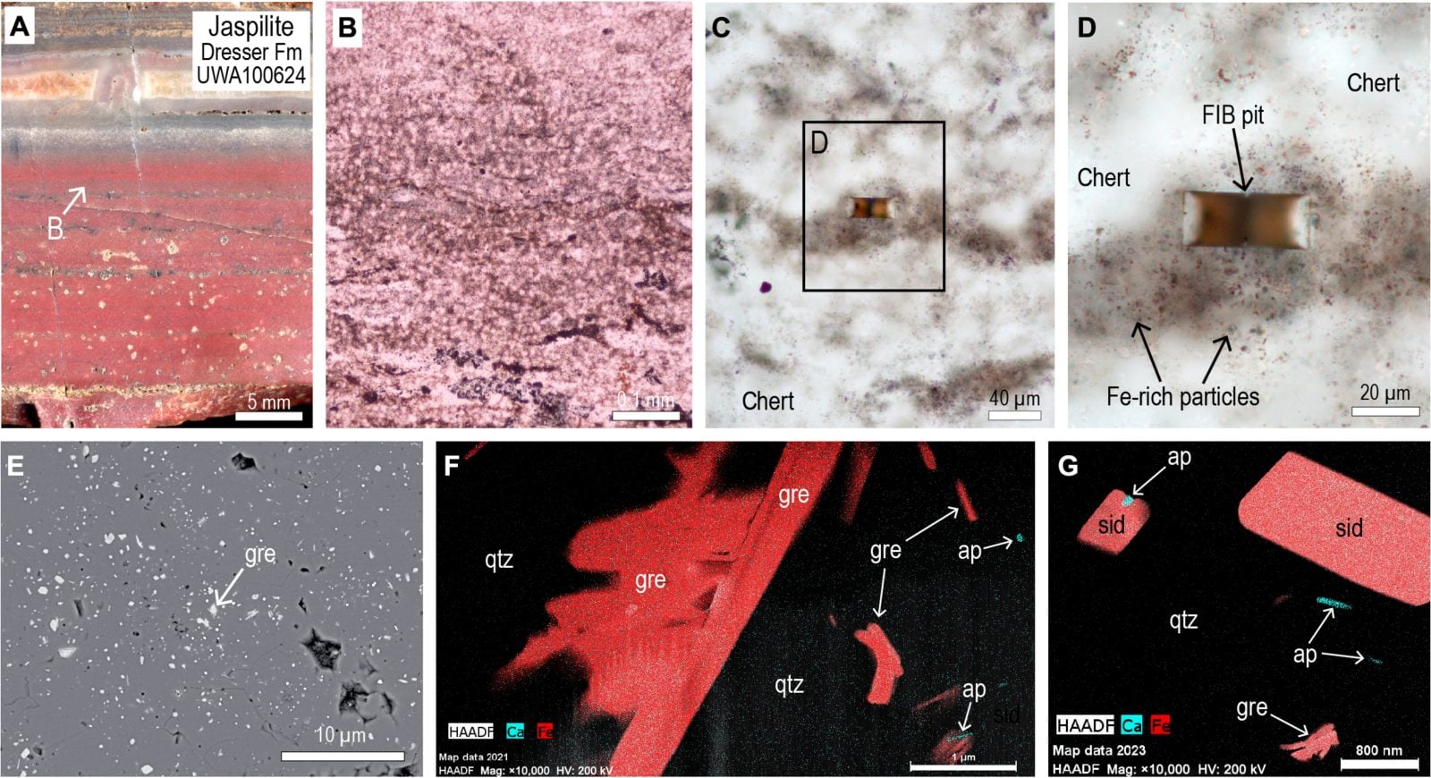 Naukowcy z Uniwersytetu Zachodniej Australii przeprowadzili badania na jaspilitach z formacji Dresser, o czym napisali w periodyku Science Advances. Przede wszystkim chcieli oni spojrzeć na skład chemiczny i mineralogiczny skał. Jedną z metod analitycznych była transmisyjna mikroskopia elektronowa. W takiej skali badacze byli w stanie sprawdzić skład nawet najmniejszych minerałów. Poza kwarcem i hematytem zidentyfikowali również nanokryształy greenalitu i fluorapatytu.