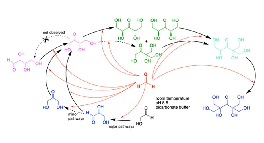 W badaniu opublikowanym w czasopiśmie Chem, naukowcy przeprowadzili eksperymenty w warunkach, które uznali za bardziej zbliżone do tych panujących na pierwotnej Ziemi – w temperaturze pokojowej i przy pH ok. 8, zamiast dotychczas stosowanego pH 12-13. Zamiast upragnionej rybozy, reakcja ta prowadziła jednak wyłącznie do powstawania rozgałęzionych struktur cukrowych, które nie mogą służyć jako budulec RNA.