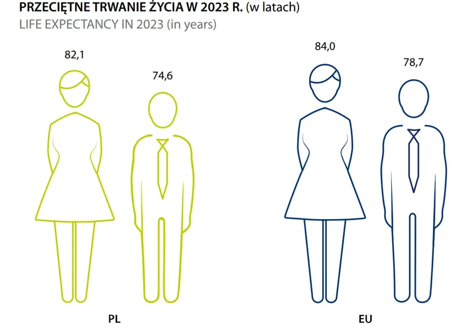 W 2024 roku statystyki przewidujące długość życia w Polsce odnotowały najwyższe wartości w historii. Mężczyźni dożywają już przeciętnie 74,93 lat, kobiety zaś żyją przeciętnie 82,26 lat. To wyraźny sygnał, że demograficzne skutki pandemii COVID-19 zostały przezwyciężone, a także swojego rodzaju rekord.