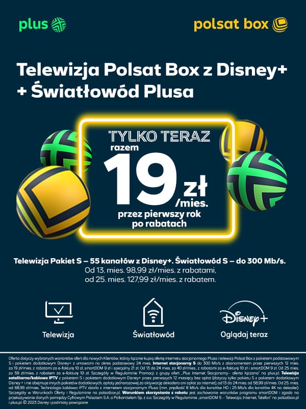 - Polsat Box z Disney+ i światłowód S Plusa z prędkością do 300 Mb/s kosztuje 19 zł/mies. przez rok.
