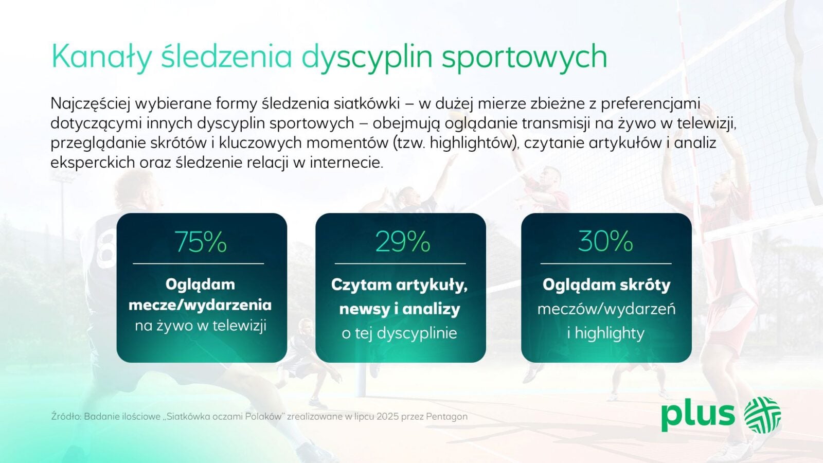 Dla ponad połowy fanów sportu oglądanie meczów siatkówki to stały punkt w kalendarzu, a dla 29% to ich ulubiona dyscyplina. Siatkówka, podobnie jak piłka nożna czy skoki narciarskie, jest chętnie oglądana w towarzystwie, choć ponad 50% respondentów woli przeżywać sportowe emocje w pojedynkę. Najpopularniejszym medium do śledzenia siatkówki jest oczywiście telewizja, ale kibice chętnie korzystają również z internetu, by oglądać skróty meczów, czytać analizy i śledzić relacje.