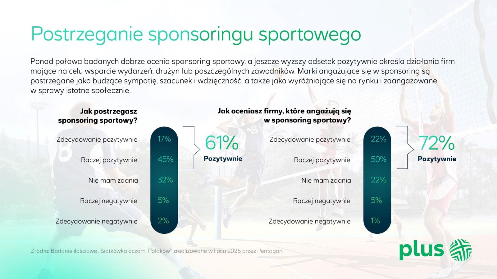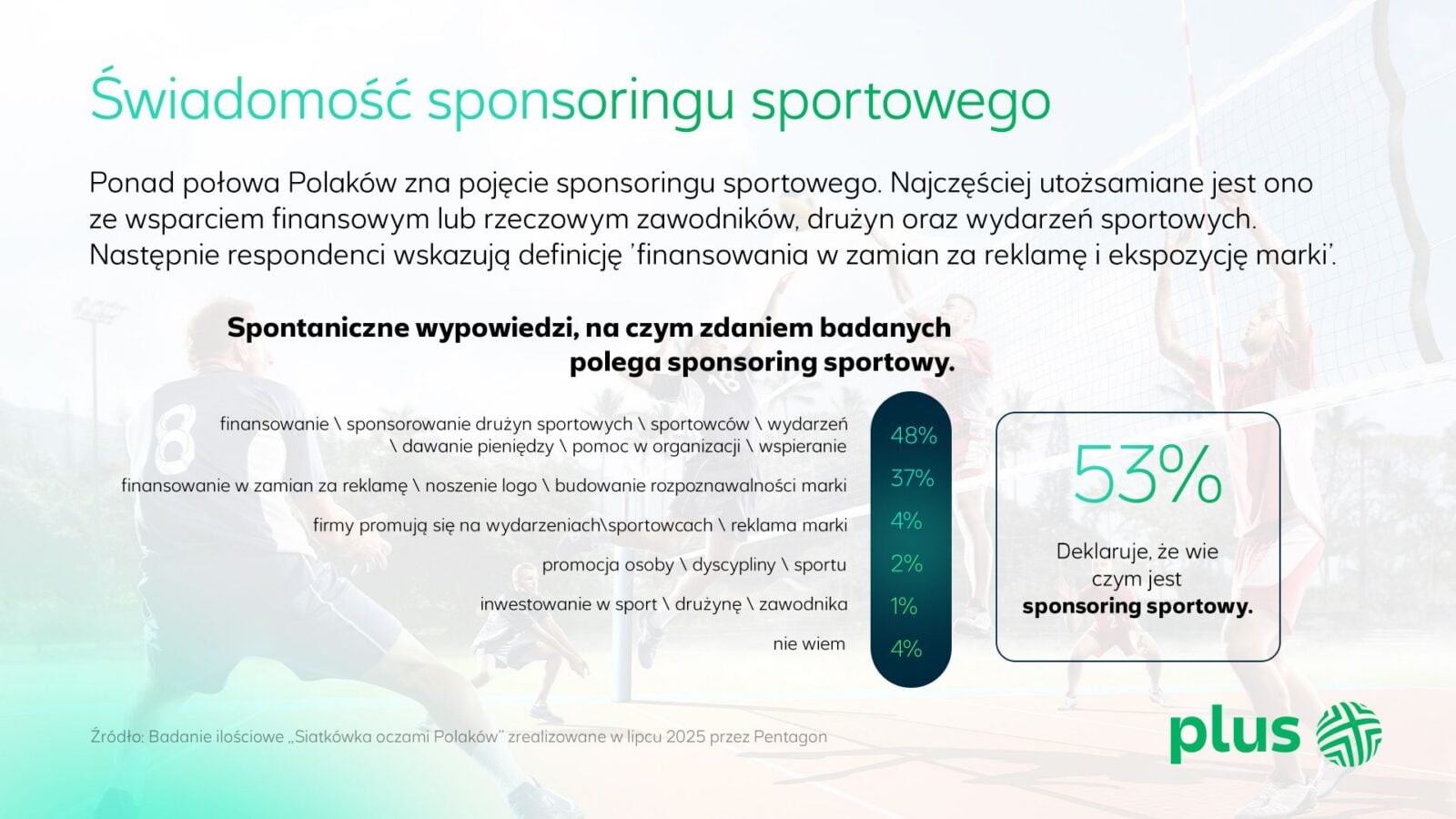 Badanie Plusa pokazało również, że 51% Polaków rozumie pojęcie sponsoringu sportowego. Najczęściej utożsamiamy go ze wsparciem finansowym drużyn i zawodników, ale tuż za tym idzie świadomość, że sponsoring to również reklama. Aż 61% Polaków ocenia sponsoring sportowy pozytywnie, a 72% dobrze postrzega działania firm, które w ten sposób wspierają sportowców.