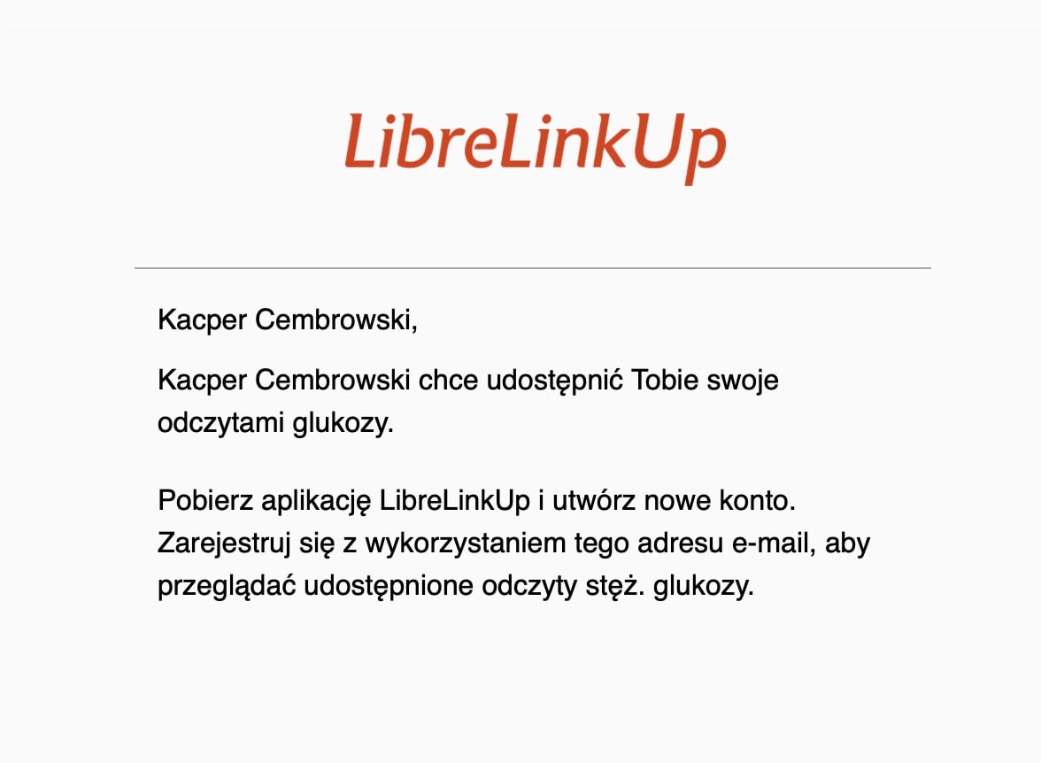 Teraz przechodzimy do drugiego kroku, czyli konfiguracji LibreLinkUp. Należy pobrać aplikację LibreLinkUp z App Store na swoim iPhone’ie. Teraz musimy się zalogować lub zarejestrować, przy wykorzystaniu tego samego adresu e-mail, który podaliśmy w LibreLink do udostępniania danych. Po zalogowaniu aplikacja automatycznie wykryje dane przesyłane z LibreLink, jeśli wszystko zostało poprawnie skonfigurowane. Na tym etapie powinniście zobaczyć swoje pomiary glukozy w aplikacji LibreLinkUp.