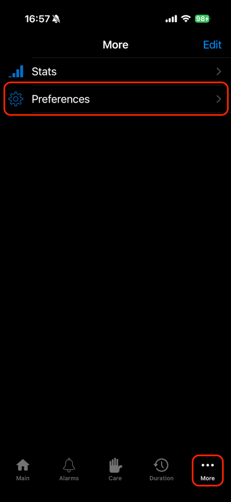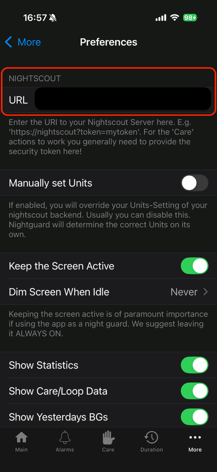 Pora na ostatnią aplikację z całej listy. Znów przechodzimy do App Store, wyszukujemy aplikację Nightguard i pobieramy ją na iPhone’a. Jeśli macie Apple Watch sparowany z telefonem, aplikacja automatycznie zainstaluje się również na zegarku (upewnijcie się, że macie włączoną opcję automatycznego pobierania aplikacji w ustawieniach Apple Watch w aplikacji Watch na telefonie). Teraz należy Otwórz Nightguard na iPhone’ie, przejść do zakładki „Więcej” (trzy kropki w prawym dolnym roku), teraz do opcji „Ustawienia” (w angielskiej wersji „Preferences”). Na górze ekranu znajdziemy pole do wklejenia Nightscout URL. Tu należy wkleić link skopiowany z Gluroo.