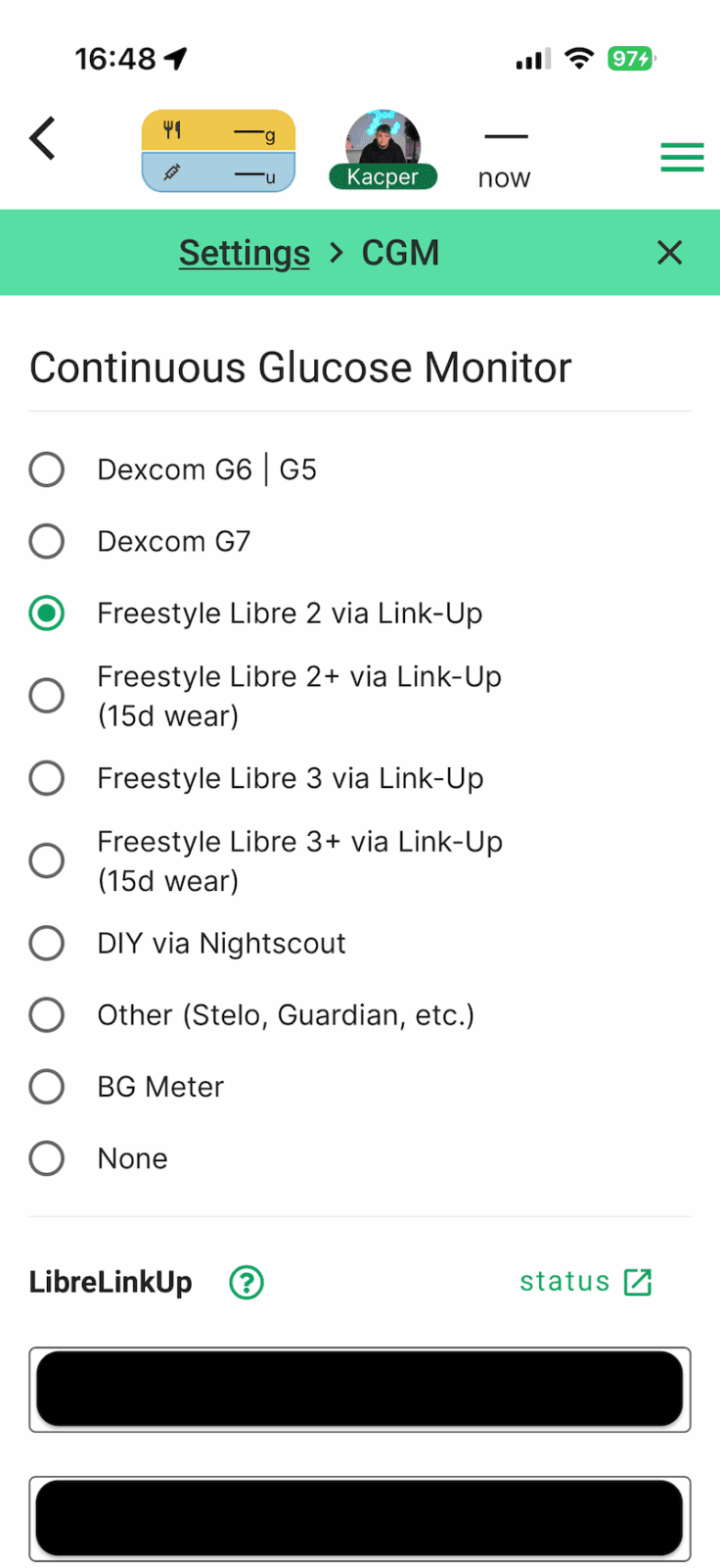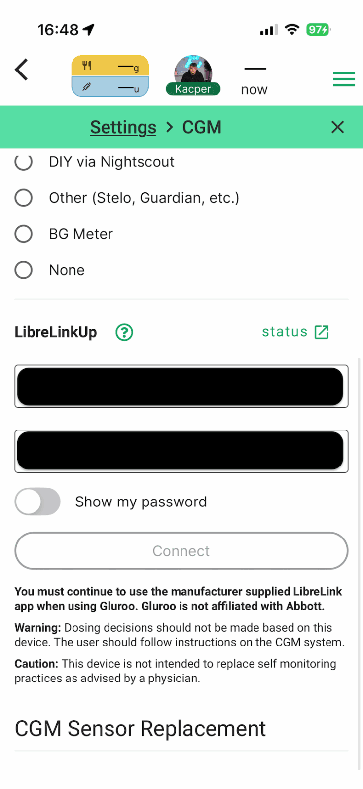 Następnie w aplikacji Gluroo należy przejść do sekcji ustawień i wybrać opcję CGM. Wybieramy, z jakich sensorów korzystamy — opcji jest kilka (Freestyle Libre 2, 2+, 3, 3+), ale niezależnie od modelu, wszystko działa przez LibreLinkUp. W okienku niżej wpisujemy swoje dane logowania do konta LibreLinkUp, czyli ustalony wcześniej e-mail i hasło. Gluroo powinno teraz automatycznie pobierać dane z naszego sensora.