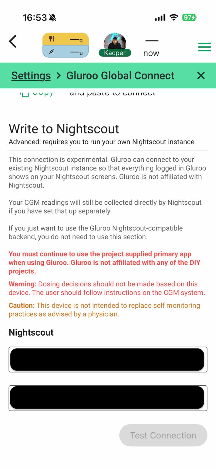 To jeszcze nie koniec. Teraz, po połączeniu w Gluroo swojego konta LibreLinkUp, musimy wrócić do zakładki Ustawienia i zejść na sam dół, do opcji „Gluroo Global Connect Nightscout”. Teraz na dole będziemy mieli okno „Nightscout URL” — to unikalny link, który umożliwia przesyłanie danych do platformy Nightscout. Jest to bardzo ważny link, który należy skopiować, gdyż będzie nam potrzebny w kolejnym kroku.