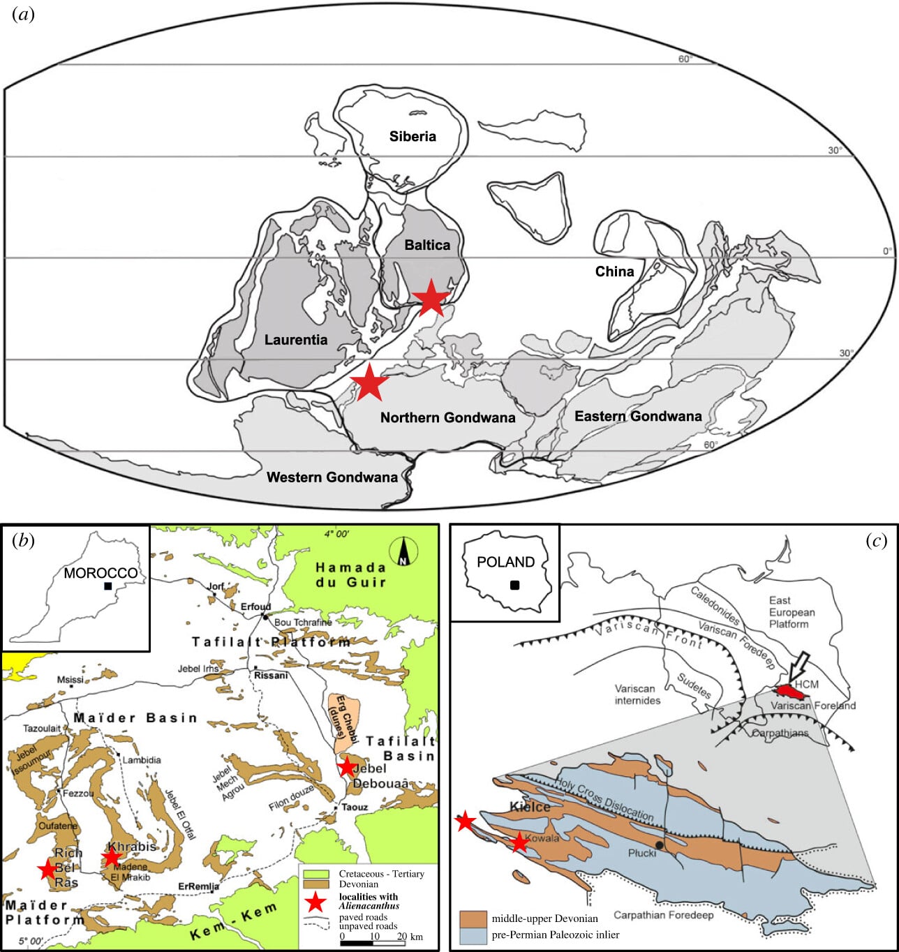 Bardzo wyjątkowym przykładem ryb pancernych jest Alienacanthus malkowskii. Drugi człon mający swój korzeń w języku polskim powinien nam coś podpowiadać. Mianowicie pierwsze skamieniałości tej ryby były odnajdywane w naszym kraju, a dokładnie w kamieniołomach Ostrówka i Kowala w Górach Świętokrzyskich. Zostały one opisane jeszcze w 1957 roku przez polskiego profesora Juliana Kulczyckiego.