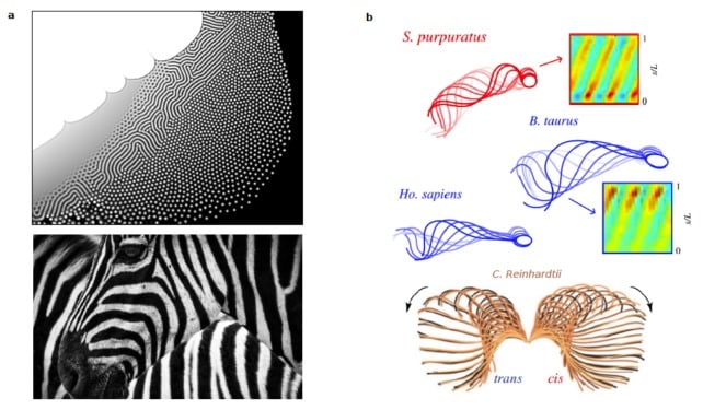 Mówiąc dokładniej, wzorce powiązane ze sposobem przemieszczania się plemników są w niewyjaśniony sposób połączone z tym, co warunkuje powstawanie pasków na sierści zebr. Wzór ten został opisany w połowie ubiegłego wieku przez Turinga, który stwierdził, że ślady mogą pojawiać się niezależnie od dwóch czynników. Czynniki te to rozprzestrzenianie się substancji chemicznych oraz wzajemne reakcje.
