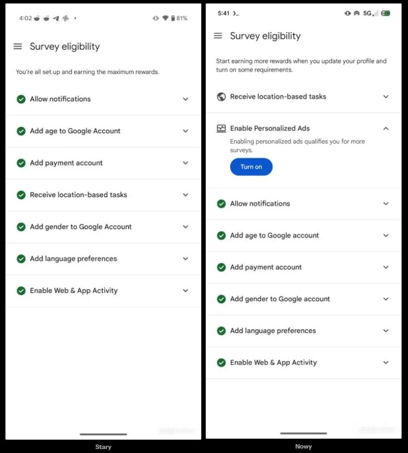 W najnowszej wersji aplikacji odkryto bowiem nowe ustawienie o nazwie Enable Personalized Ads, zachęcające użytkowników do wypełniania większej liczby ankiet, co oznacza również możliwość większego zarobku. Oczywiście nie za darmo, ponieważ w zamian musimy udostępnić firmie informacje o sobie w celu personalizacji reklam. Do tej pory częstotliwość otrzymywanych zadań w Premiach była stosunkowo niewielka, bywały dni, w których Google podsuwał użytkownikom więcej ankiet, by w innych nie dawać ich wcale. Wydaje się, że w ten sposób będzie ich znacznie więcej.