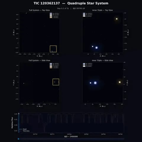 Odnaleziony układ TIC 120362137 należy do rzadkiej konfiguracji “3+1”. Wewnątrz pracuje trójka gwiazd w hierarchii orbit, a czwarta krąży wokół nich jako zewnętrzny składnik. Wewnątrzna trójka mieści się w przestrzeni mniejszej niż orbita Merkurego, a całość zamyka się w skali porównywalnej do odległości Jowisza od Słońca. To układ, w którym grawitacja nie ma miejsca na luźne ustawienia, tu liczy się geometria i rytm.