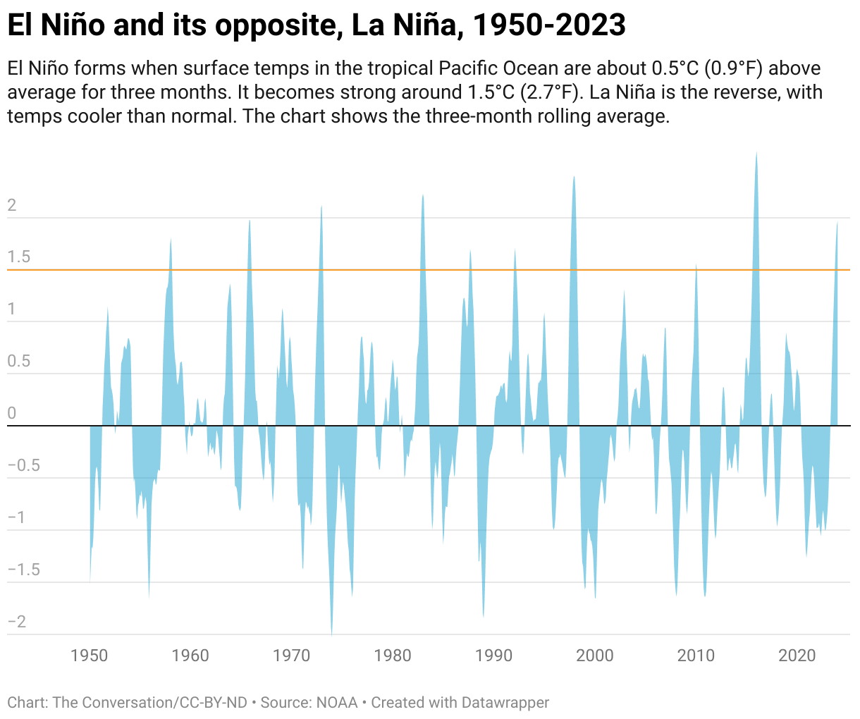 Kompletne odwrócenie tej sytuacji ma miejsce wtedy, gdy pasaty słabną, upwelling zostaje zatrzymany, a wschodni obszar Oceanu Spokojnego rozgrzewa się do anomalnych wartości. Wówczas w Ameryce pojawiają się rekordowe powodzie, a Australia cierpi z powodu suszy. Poza ekstremalnymi zjawiskami naturalnymi El Niño również podnosi chwilowo globalną temperaturę, o czym mogliśmy przekonać w 2023 roku, który był rekordowy w historii pomiarów.