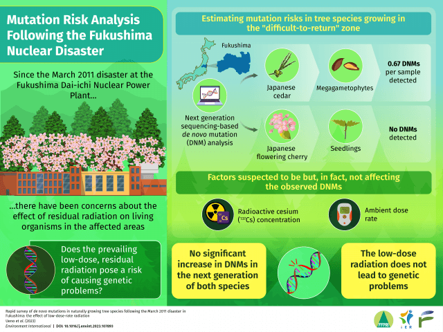 Obecność radioaktywnego cezu (137Cs) i natężenie dawki promieniowania otoczenia nie miały wpływ na obecność lub brak mutacji w próbkach DNA cedru japońskiego i wiśni piłkowanej. To wskazuje, że tempo mutacji w drzewach rosnących na skażonych terenach Japonii nie wzrosło znacząco. Jest to pierwszy raz, kiedy wykorzystano częstotliwość mutacji de novo do oceny następstw katastrofy jądrowej. W kontekście coraz większego zainteresowania energią atomową na świecie (także w Polsce) jest to bardzo ważne.