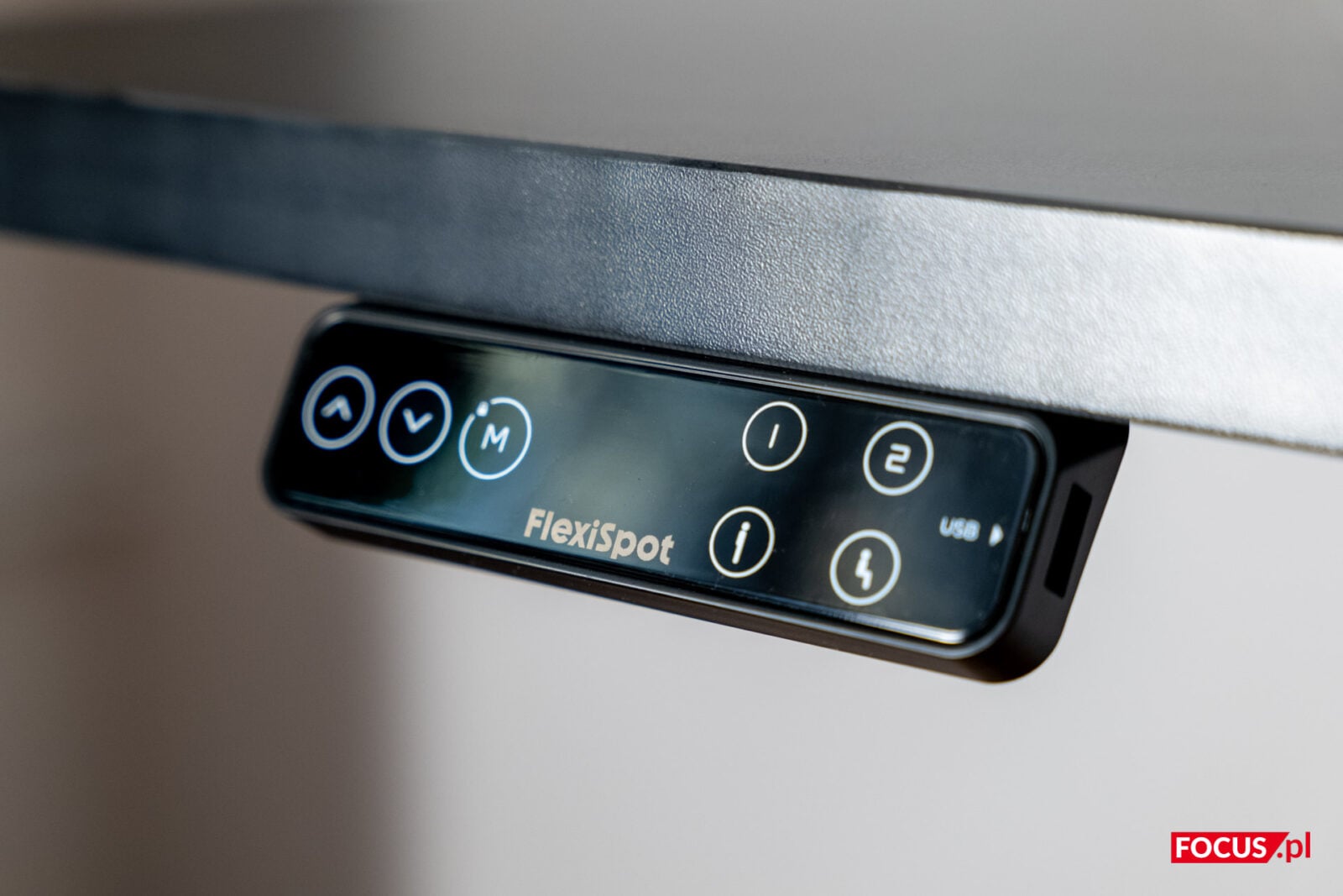 Skoro wspomnieliśmy o silnikach to tak, biurko ma regulowaną wysokość w zakresie 63,5 – 128,5 cm. W pamięci urządzenia możemy zapisać własne ustawienia wysokości, a sterowanie odbywa się za pomocą wygodnego panelu. Biurko ma też wbudowany mechanizm, który zapobiega opuszczeniu go zbyt nisko, kiedy pod blatem znajduje się jakaś przeszkoda. Jeśli silniki poczują opór, proces opuszczania zostanie zatrzymany. Dotyczy to również podnoszenia. Co też jest ważne, możemy tu wprowadzić blokadę rodzicielską, aby ciekawskie dziecko nie mogło samodzielnie zmienić wysokości blatu.