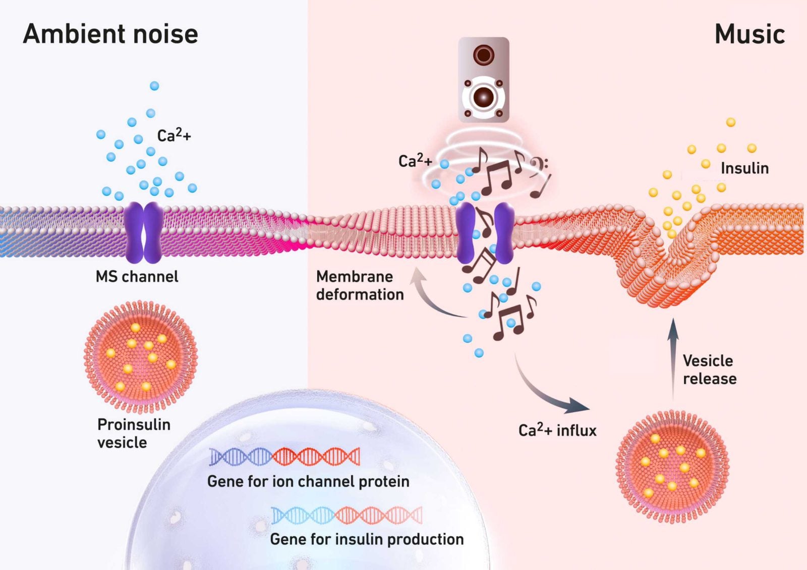 Tak zmienione komórki zawierają kanał jonowy, który otwiera się w odpowiedzi na dźwięk, umożliwiając przepływ wapnia do komórki. To powoduje odwrócenie ładunku w błonie komórkowej, co z kolei sprawia, że zgromadzone wewnątrz pęcherzyki wypełnione insuliną łączą się z błoną komórkową i w efekcie uwalniają insulinę na zewnątrz.