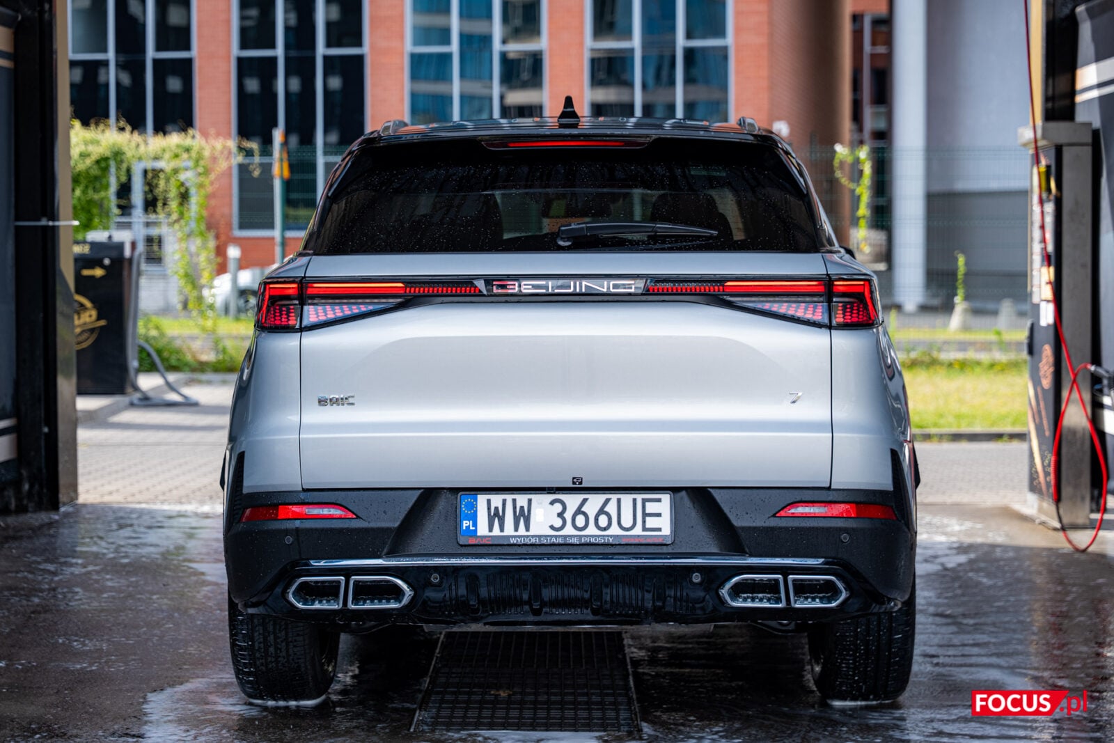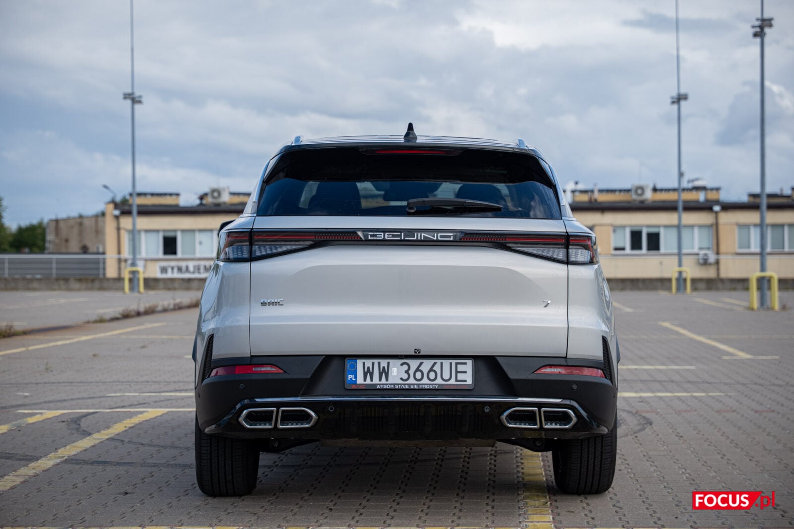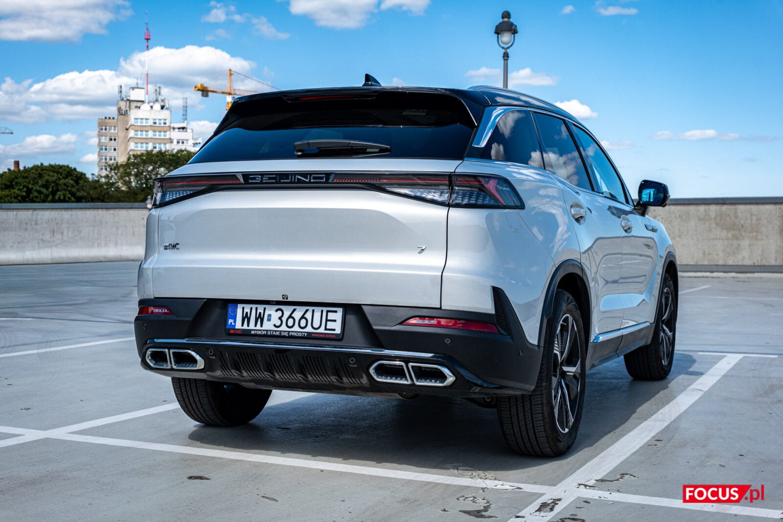 Jednocześnie, jako że mamy do czynienia z chińskim samochodem, to BAIC Beijing 7 ma w sobie trochę chińskiego bajeranctwa. Cztery wydechy to przerost formy nad treścią, podobnie jak podświetlany napis “Beijing” w tylnej części (choć wiem, że podobnie podświetla się logo Cupry, to w dalszym ciągu pomysł na granicy kiczu). W srebrnym, testowanym wariancie z czarnym dachem nieco umyka też masywność lusterek, a sami najpewniej nie zobaczycie także, że dzienne światła w kształcie liter “L” stały się niemal integralną częścią grilla. Muszę przyznać, że mnie te zabiegi stylistyczne ujęły, natomiast są one niecodzienne. Dlatego też popatrzcie i sami oceńcie.