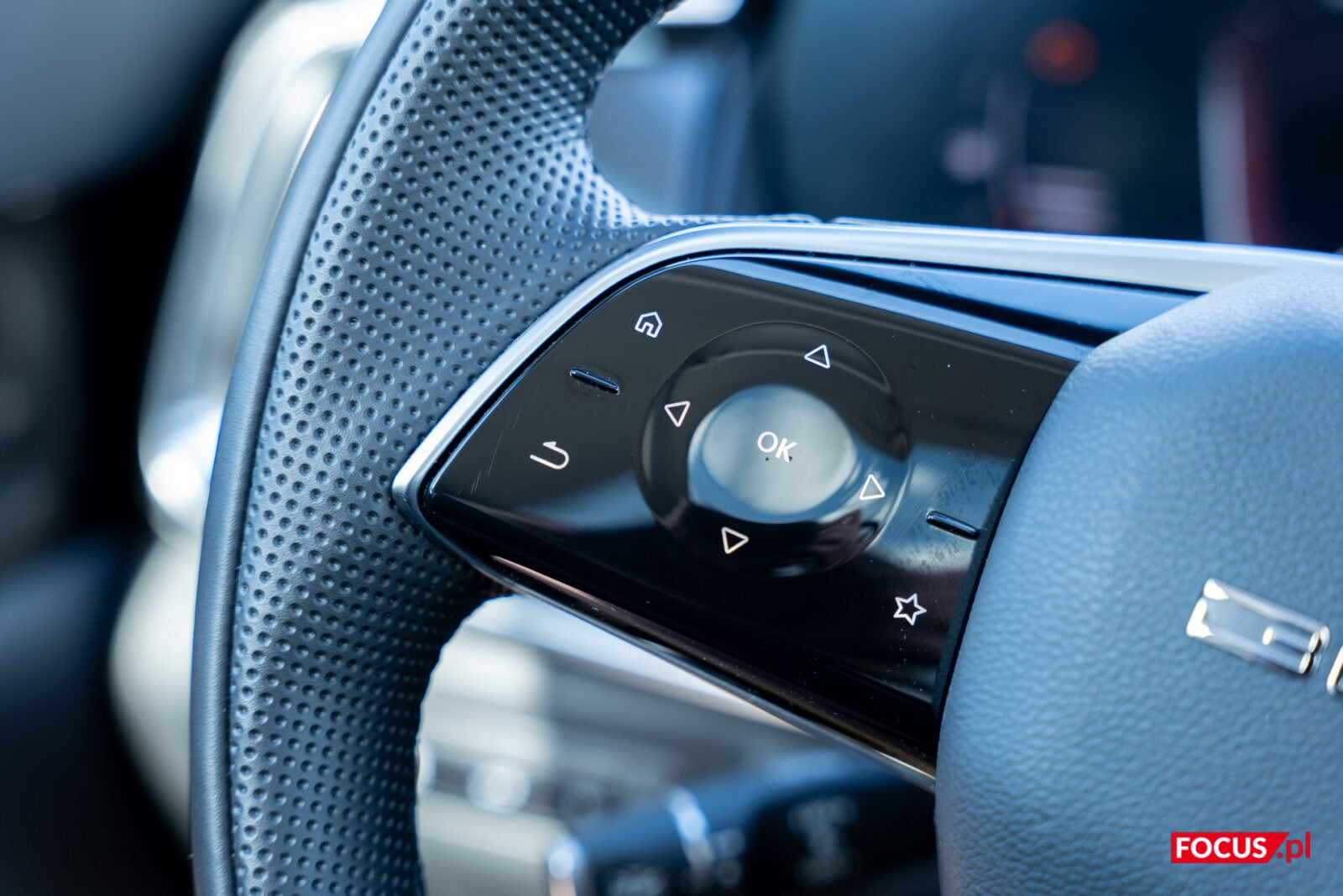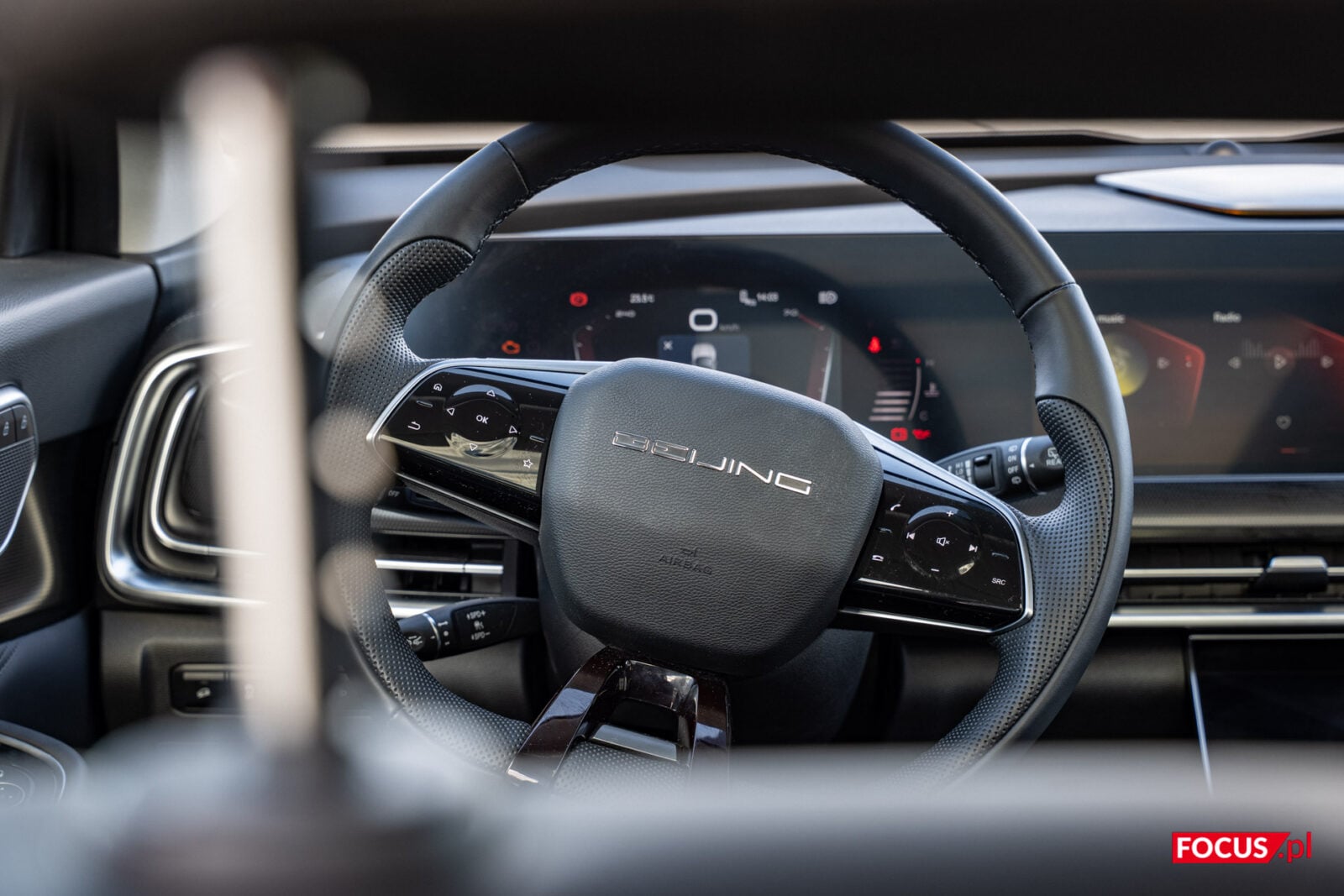 Zasiądźmy za sterem BAIC Beijing 7. Samochodowi wiele można wybaczyć, zwłaszcza gdy weźmie się w dłonie wygodną i jakby idealnie skrojoną, przynajmniej pod moje ręce, kierownicę. Jej wyprofilowanie to małe dzieło ergonomii i nie mogę się o nie przyczepić. Gorzej, gdy próbuję nacisnąć umieszczone na niej przyciski, które z niewiadomych przyczyn ukryto pod plastikowymi, błyszczącymi panelami.