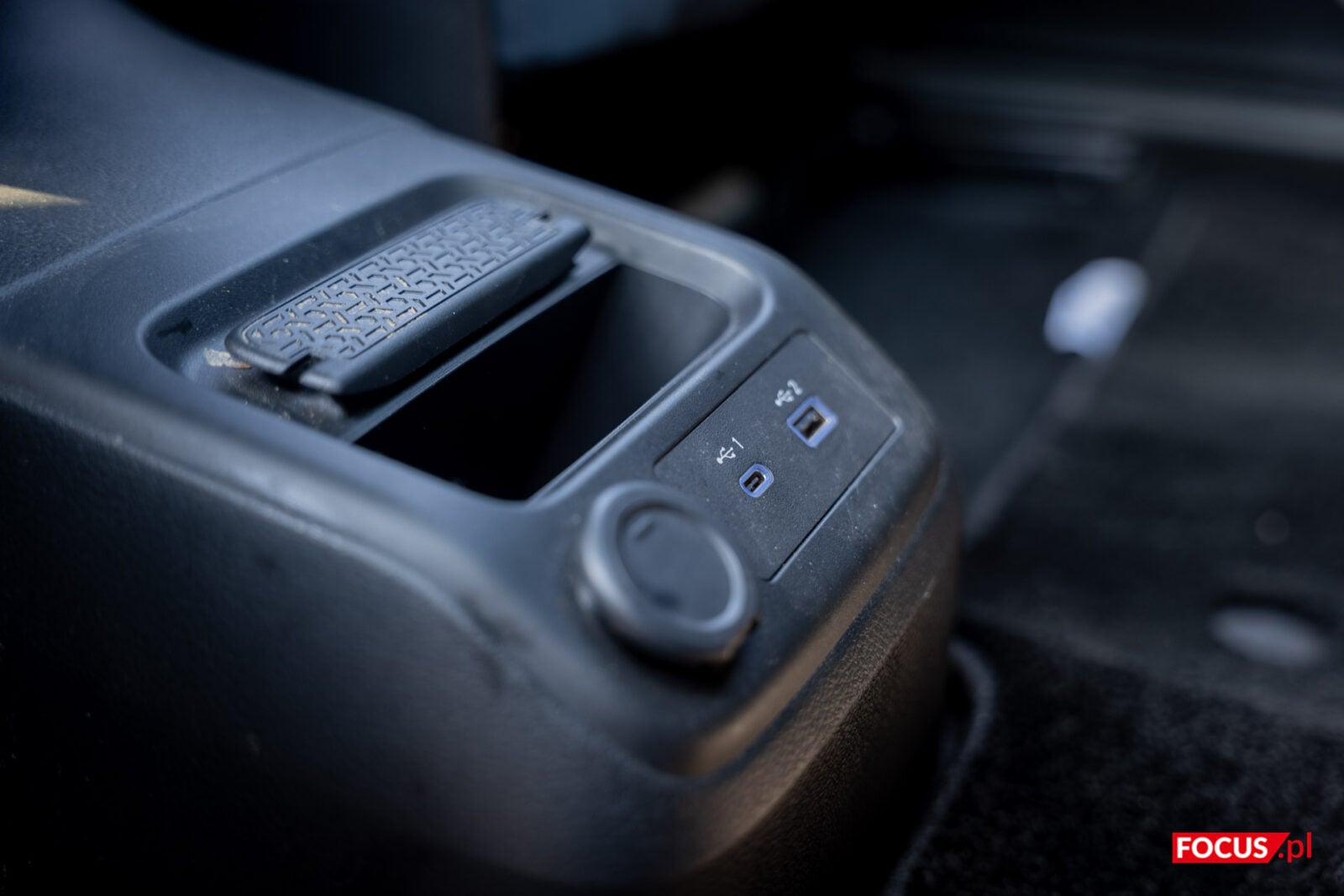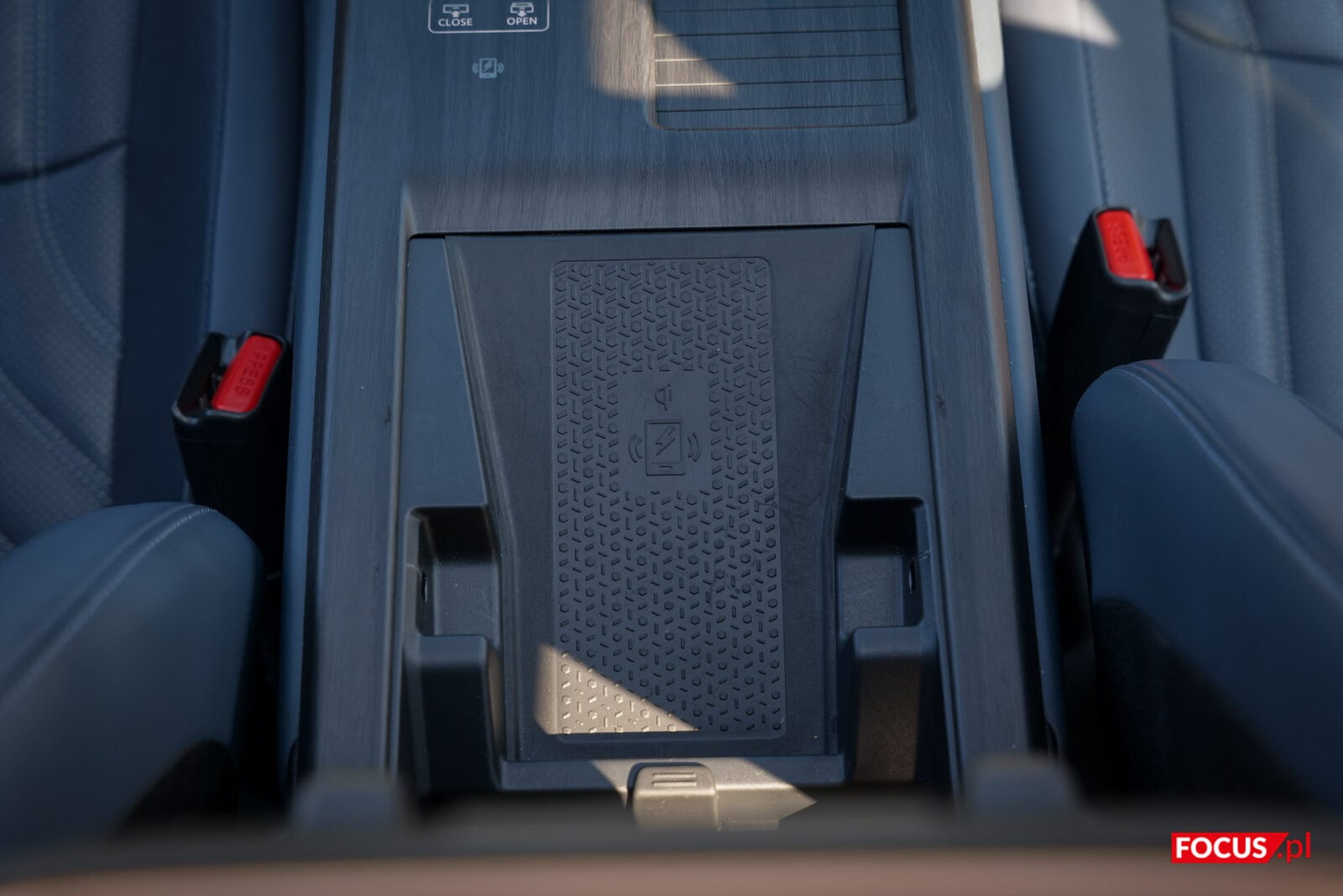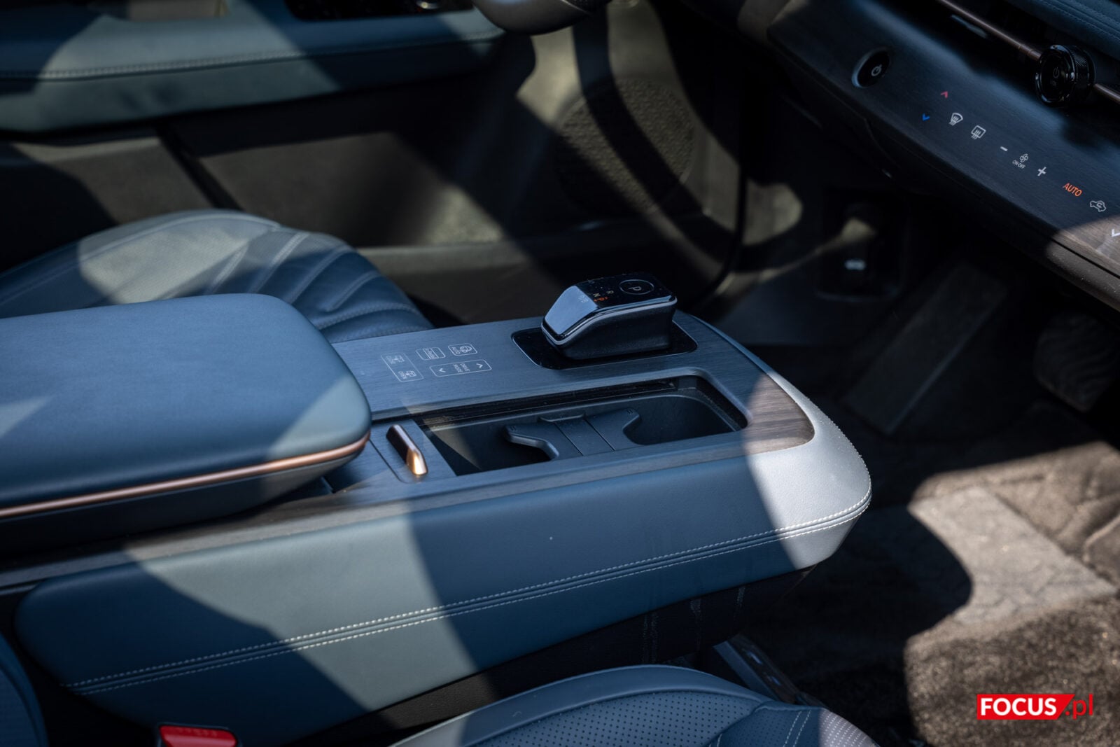 Pod “poduszką” w tylnej części konsoli, która jest też schowkiem, kryje się kieszonka z indukcyjnym ładowaniem telefonu. Jako, że to jedyne miejsce dla smartfonu, to dziwi, że tak daleko są porty do przewodowego łączenia działające z Android Auto i Apple CarPlay (jedno USB-C, jedno USB-A). Aby schować tam telefon, musimy każdorazowo odchylić schowek. Na górze znajdziemy też mechanizm do zmiany biegów. Tak naprawdę drążek ten imituje faktyczne przeciąganie i przełączanie się między trybami, ale robi to w przyjemny sposób, a ergonomiczna konstrukcja ułatwia chwyt. Boczny przycisk jest niezbędny do przełączania na bieg wsteczny.