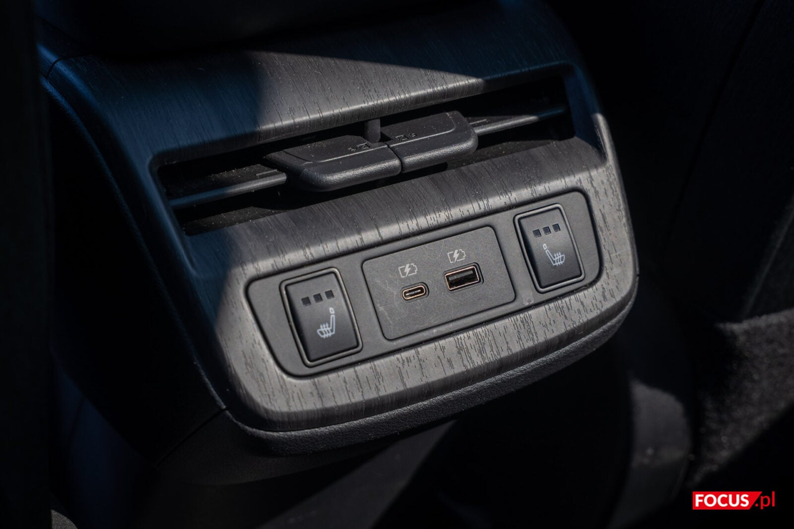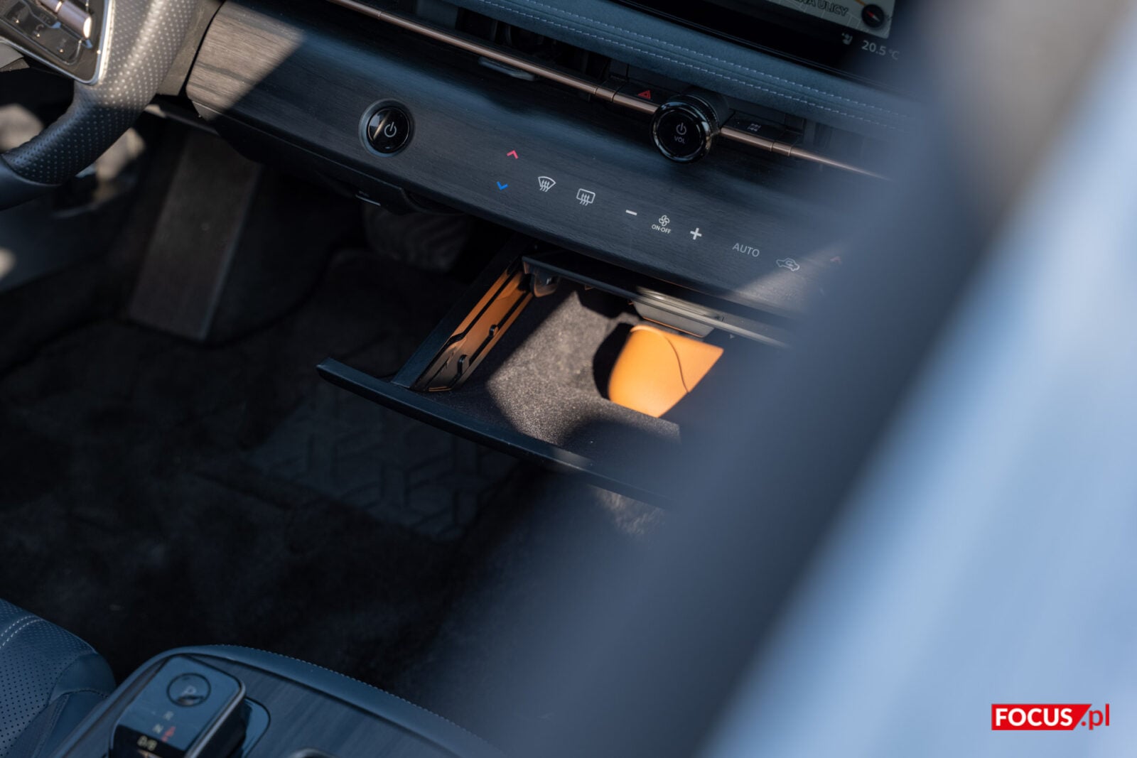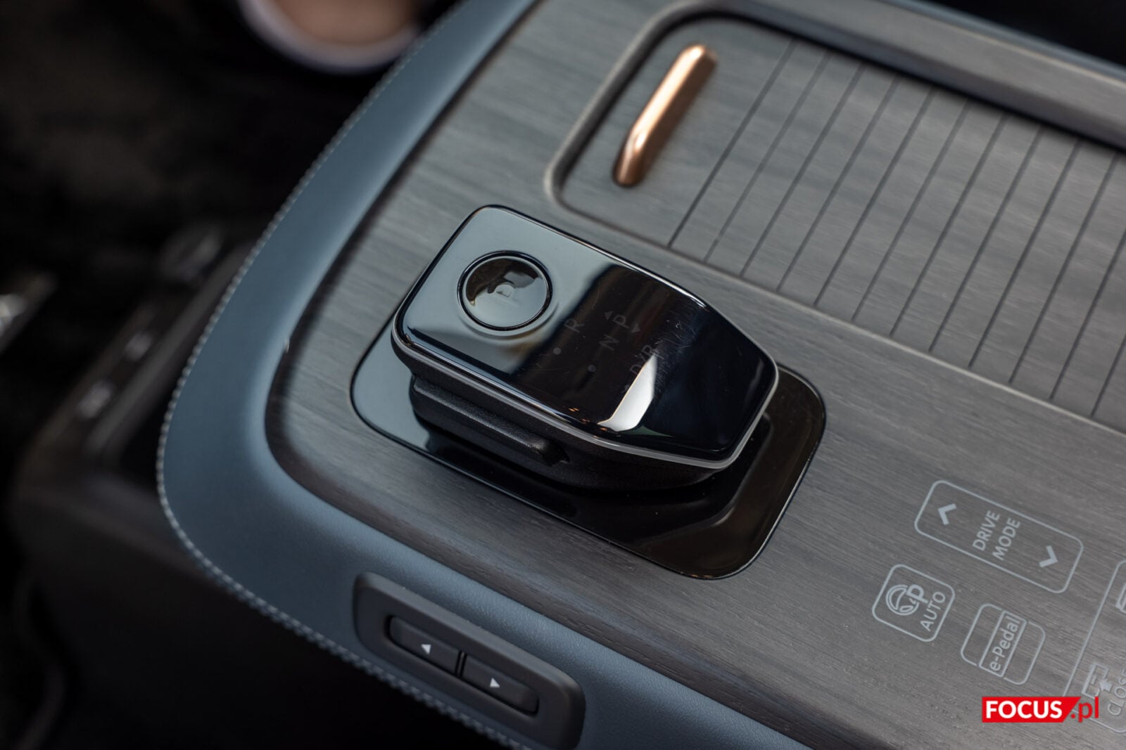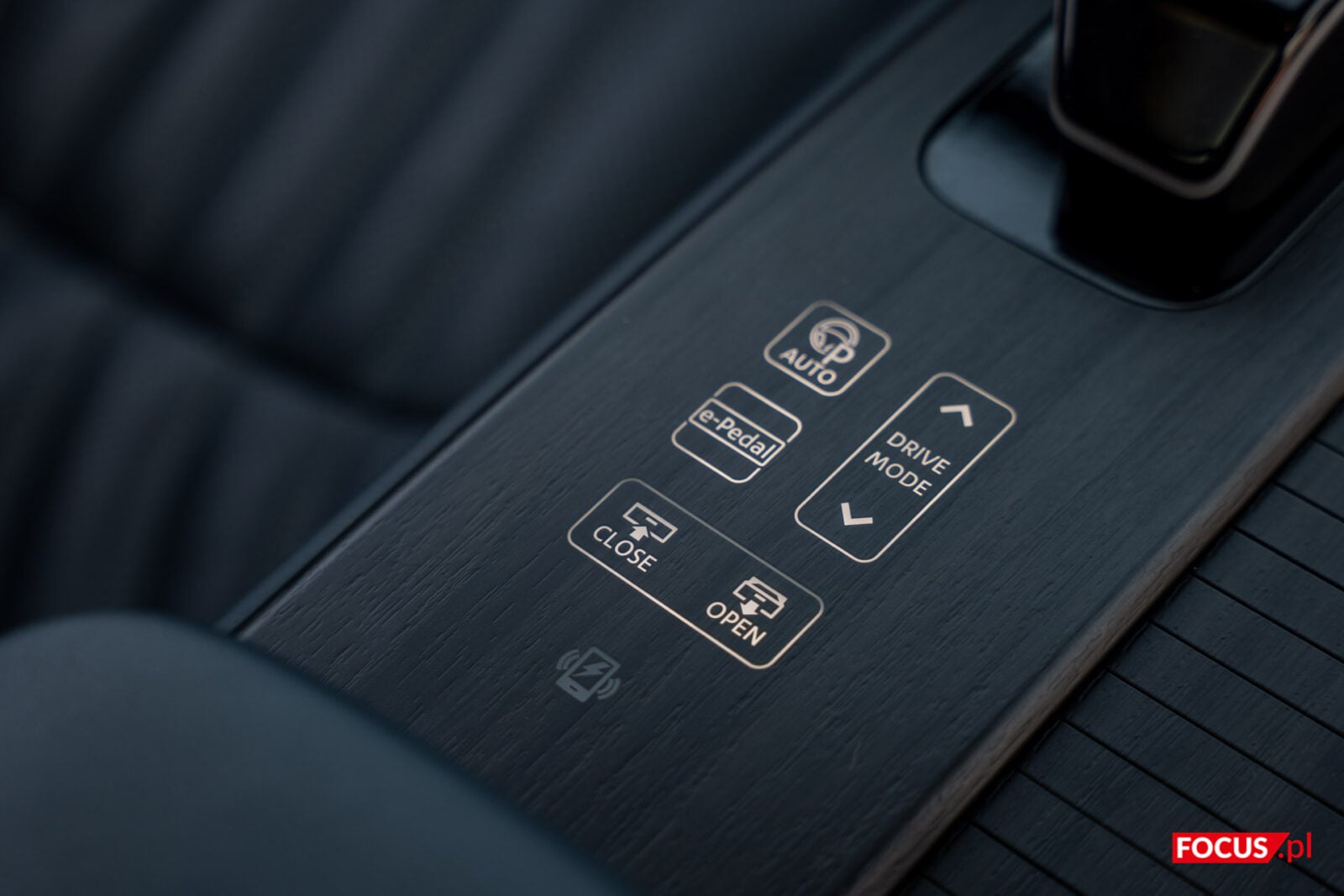 Pod “poduszką” w tylnej części konsoli, która jest też schowkiem, kryje się kieszonka z indukcyjnym ładowaniem telefonu. Jako, że to jedyne miejsce dla smartfonu, to dziwi, że tak daleko są porty do przewodowego łączenia działające z Android Auto i Apple CarPlay (jedno USB-C, jedno USB-A). Aby schować tam telefon, musimy każdorazowo odchylić schowek. Na górze znajdziemy też mechanizm do zmiany biegów. Tak naprawdę drążek ten imituje faktyczne przeciąganie i przełączanie się między trybami, ale robi to w przyjemny sposób, a ergonomiczna konstrukcja ułatwia chwyt. Boczny przycisk jest niezbędny do przełączania na bieg wsteczny.