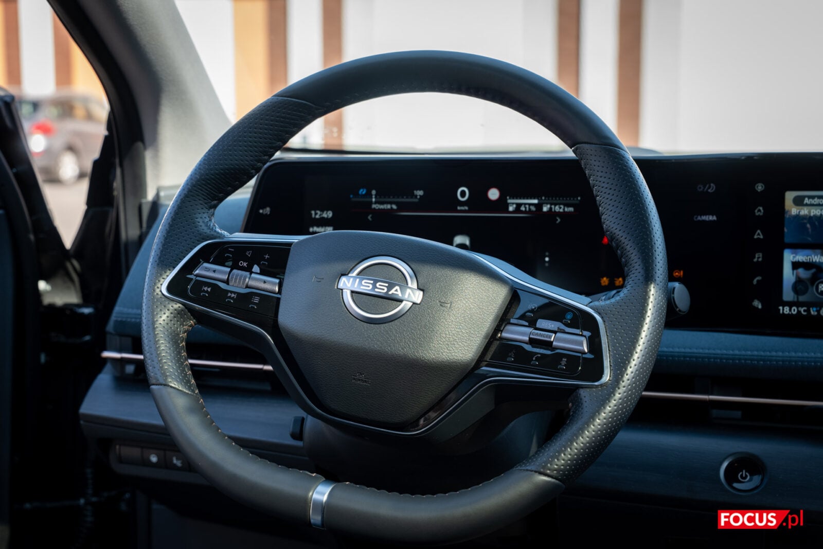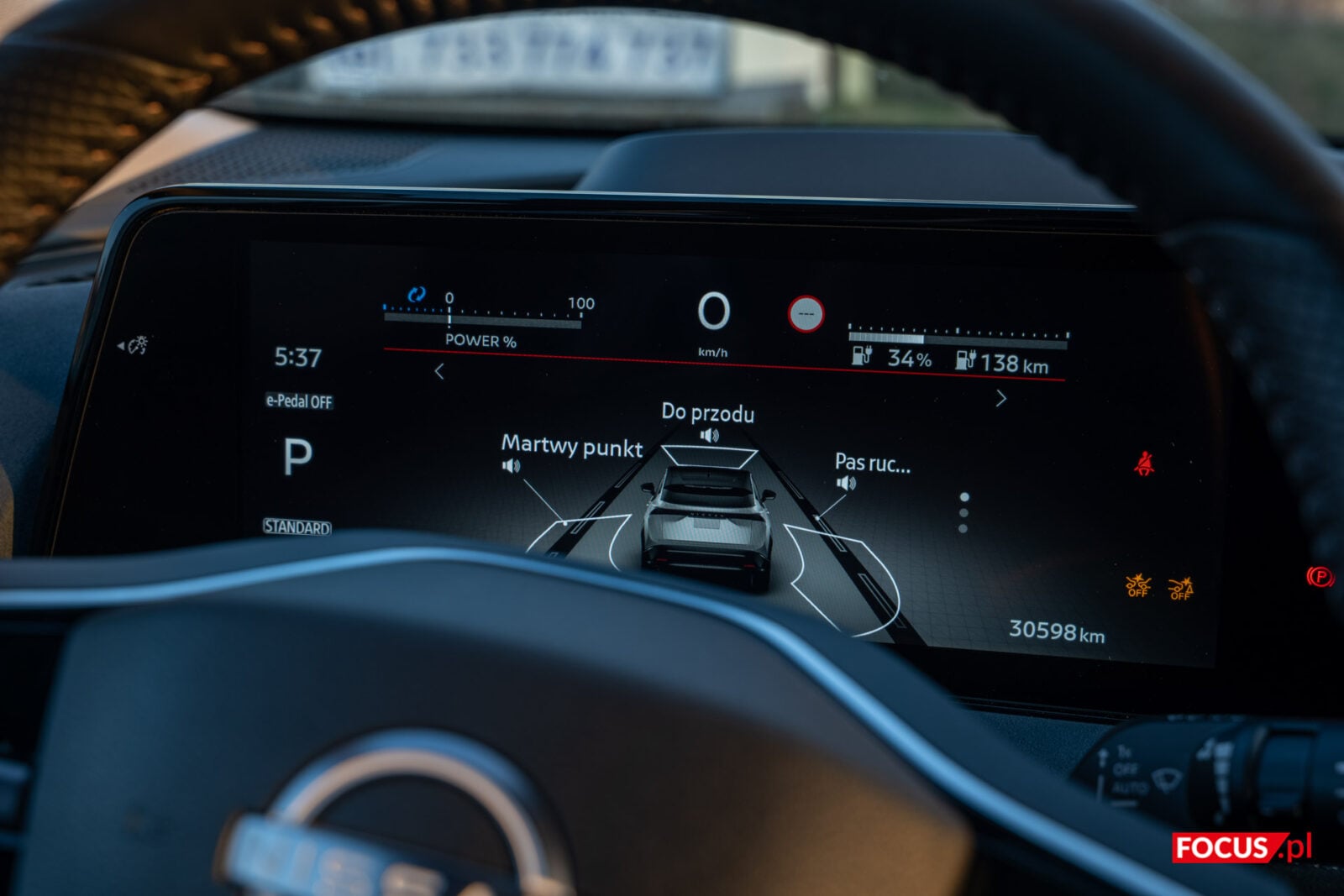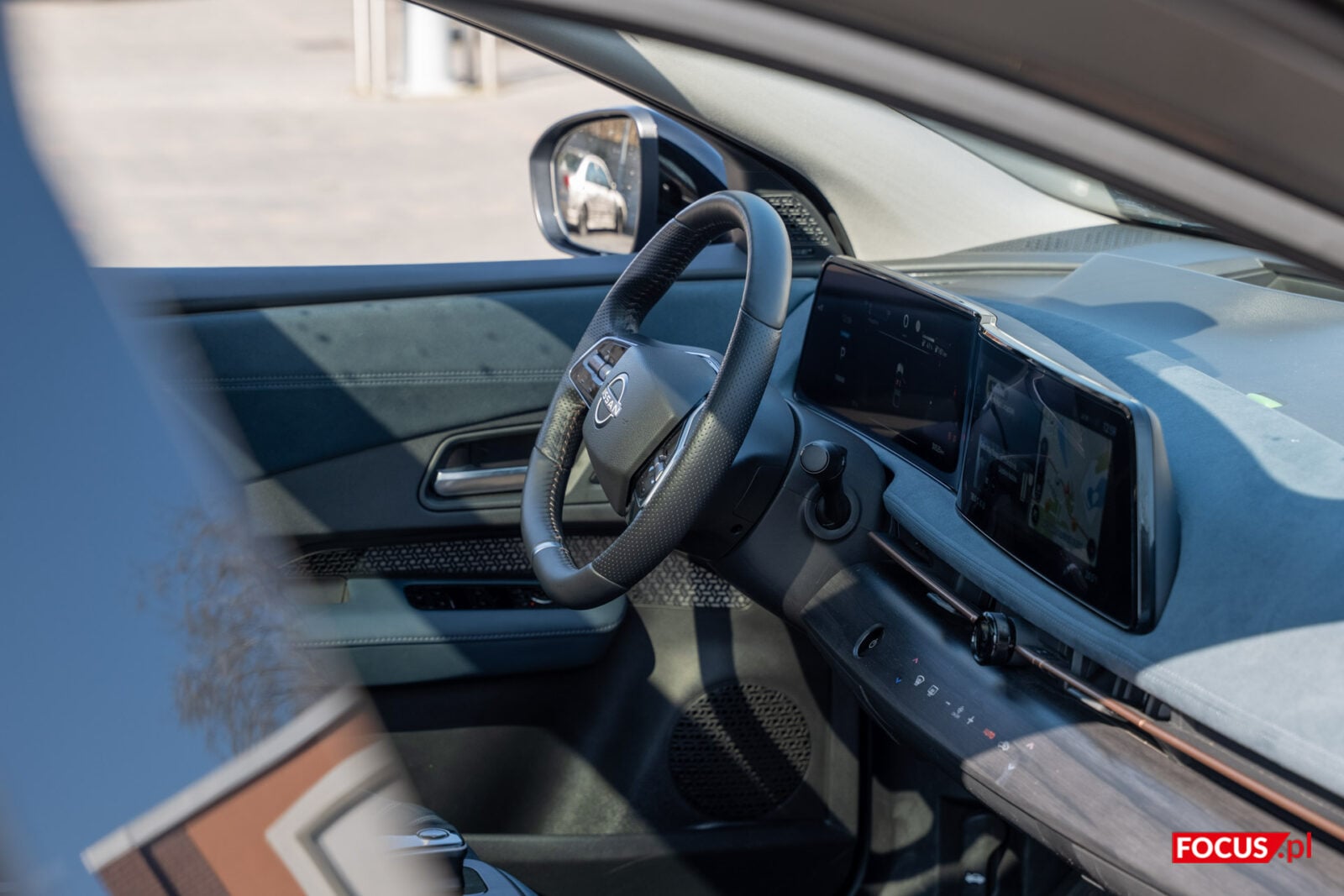 Nissan trzyma się pewnej filozofii projektowania swoich samochodów. Ekrany przy kierowcy są do zarządzania jazdą i ewentualnego przełączenia muzyki lub odebrania połączenia, a ekran w centrum przeznaczono do zarządzania multimediami i połączeniami. Pomiędzy tymi dwoma panelami znajduje się mały panel dotykowy, który pozwala włączyć obraz z kamer, niezbędny do parkowania ze względu na przeciętną widoczność z tylnego lusterka, a także przełączać się między trybem jasnym i ciemnym. Szkoda, że na większym ekranie nie zmienimy ustawień związanych z jazdą, bo mogłoby to sporo ułatwić.